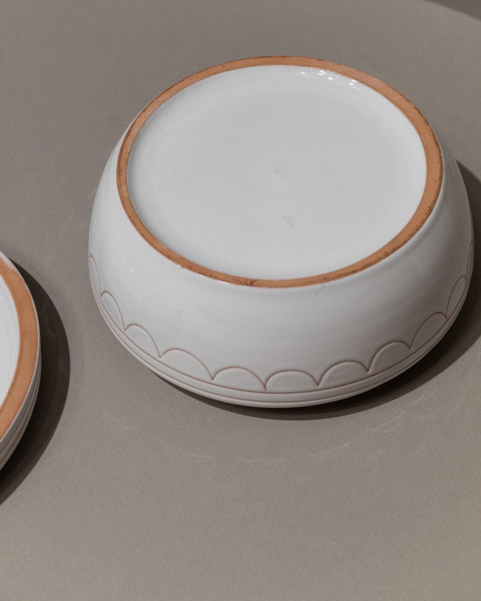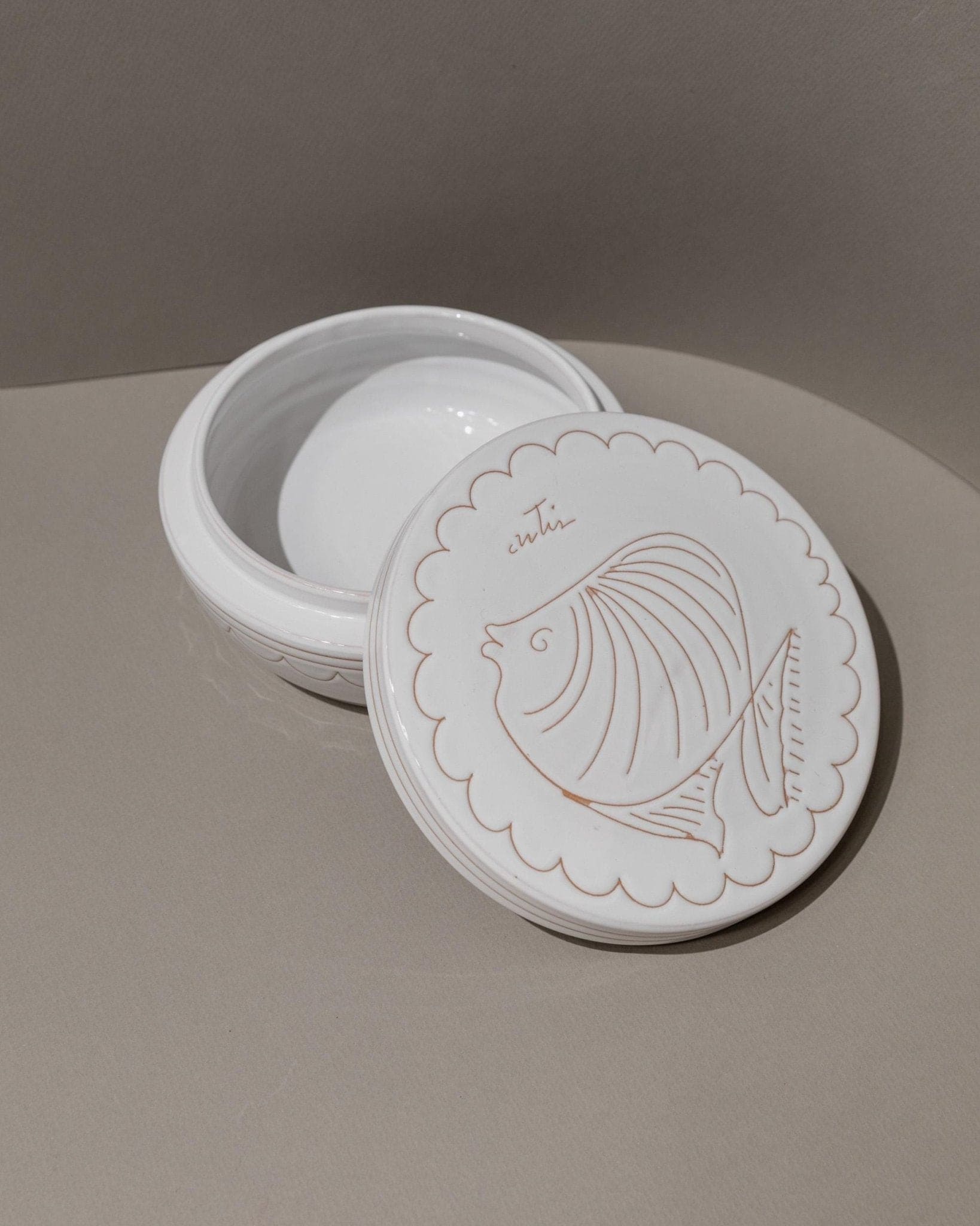 Entdecke eine außergewöhnliche Vintage Keramikschale mit Deckel aus Italien, gefertigt in den 1970er Jahren. Dieses mid century modern Designobjekt besticht durch sein handgeschnitztes, nautisches Motiv mit detailreichen Wellen- und Fischreliefs – ein echtes Highlight für Liebhaber des Space Age Stils. Die weiße Glasur auf Terrakotta verleiht der Schale eine elegante Ausstrahlung und macht sie zu einem vielseitigen Deko-Objekt für Küche oder Bad. Dank ihrer sehr guten Qualität eignet sich die Schale auch hervorragend als stilvolles Geschenk.