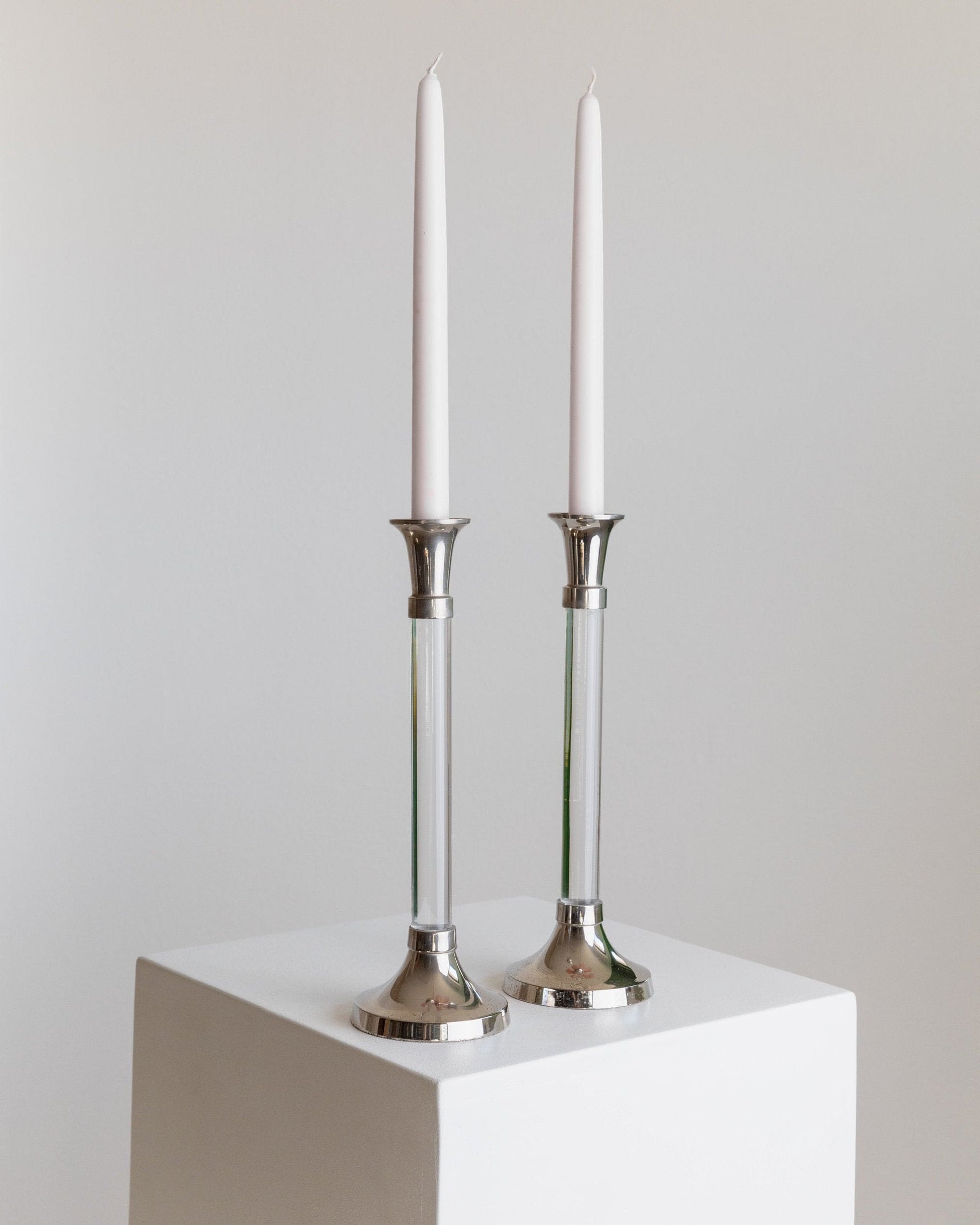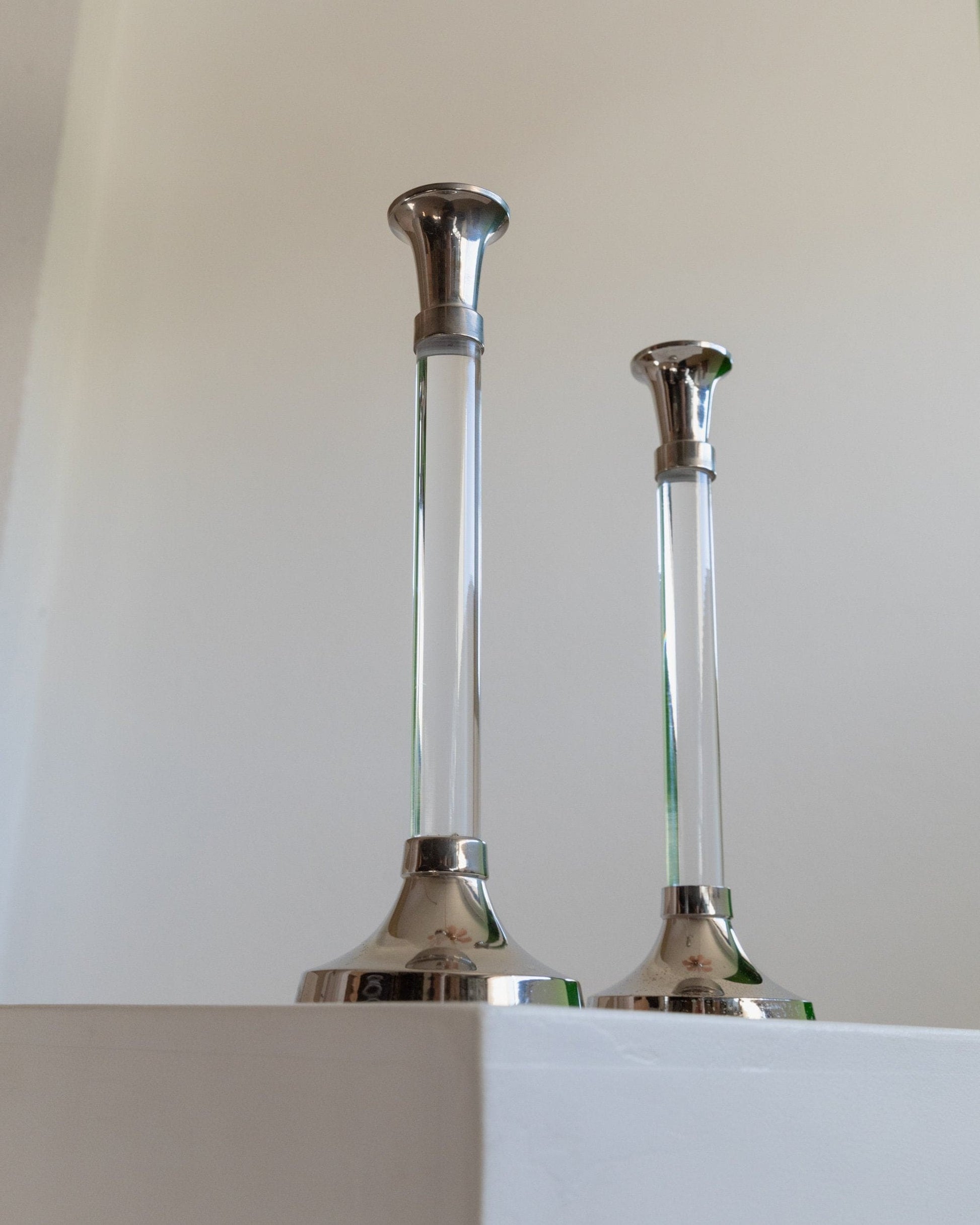 Verleihe Deinem Zuhause mit diesem Set aus zwei Vintage-Kerzenhaltern Eleganz. Hergestellt in Italien in den 1970er Jahren, vereinen diese Kerzenhalter stilvoll transparentes Acrylglas mit verchromtem Metall. Ihr zeitloses Design fügt sich perfekt in jede Umgebung ein und ist ideal für den Esstisch oder das Wohnzimmer. Sie setzen wunderschöne Akzente und schaffen eine warme, einladende Atmosphäre.