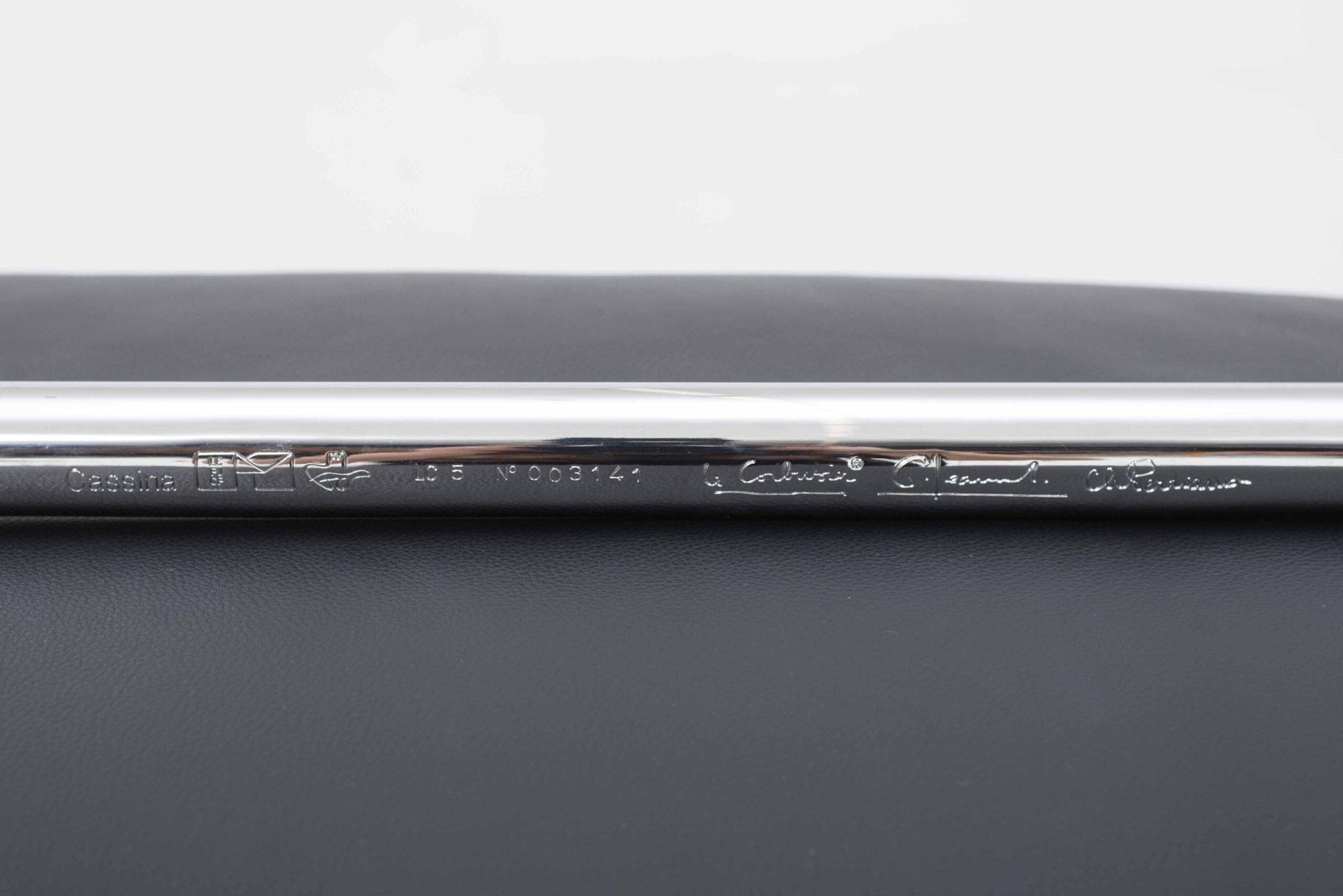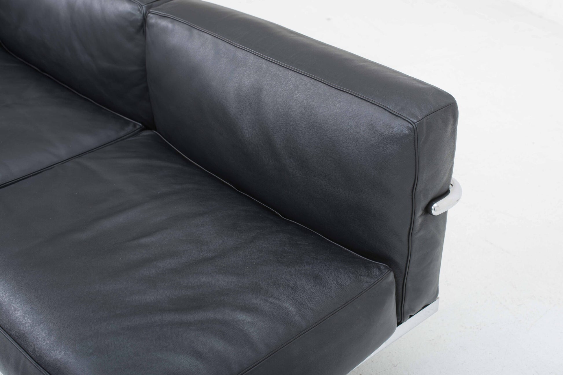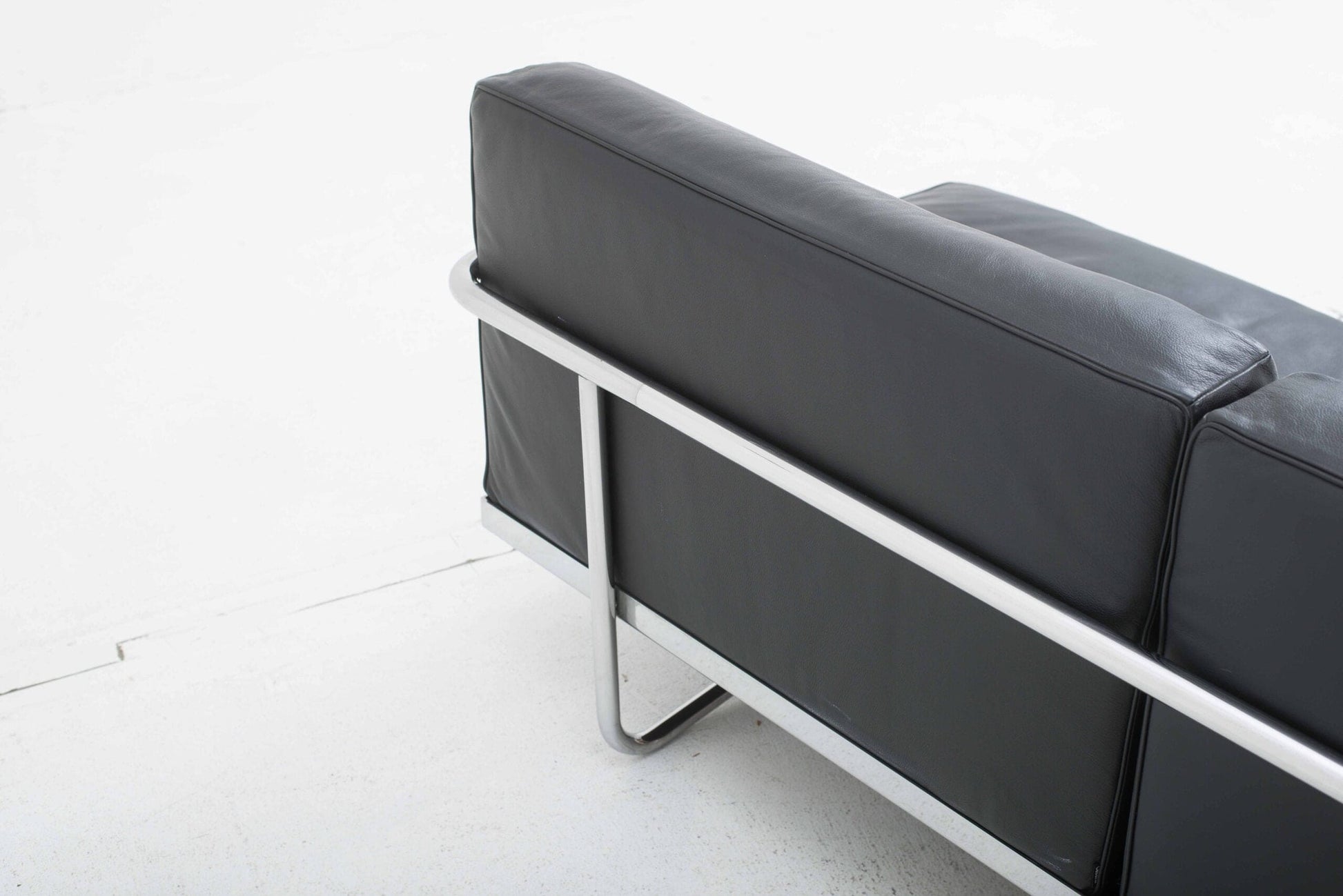 - **Materialien**: Verchromter Stahlrohrrahmen, schwarze Lederkissen mit Daunenfüllung