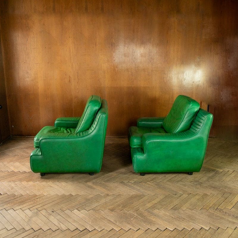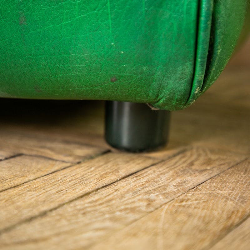 Die Bezüge bestehen aus hochwertigem Echtleder in einem satten grünen Ton, der nicht nur ins Auge fällt, sondern auch eine reiche Patina entwickelt hat. Das Leder zeigt genau die Art von Gebrauchsspuren, die Vintage-Stücke begehrenswert machen – ehrlich, lebendig, charaktervoll.