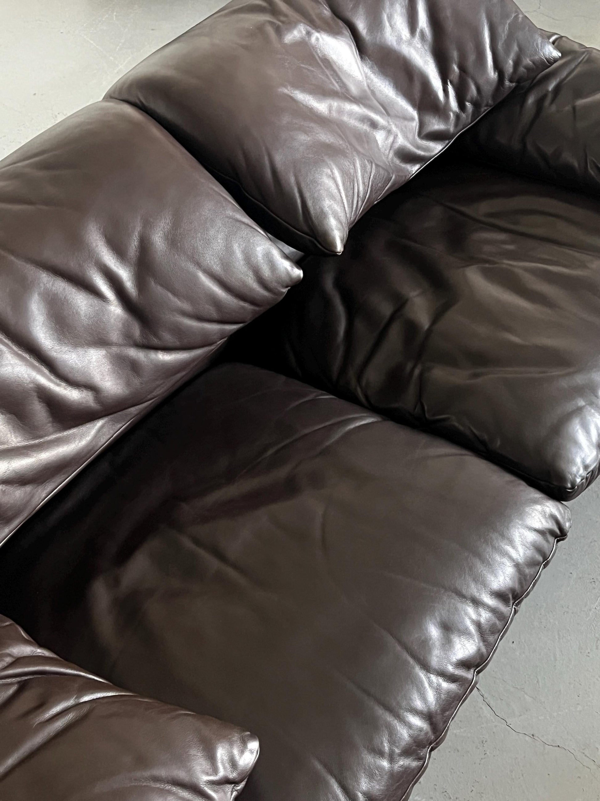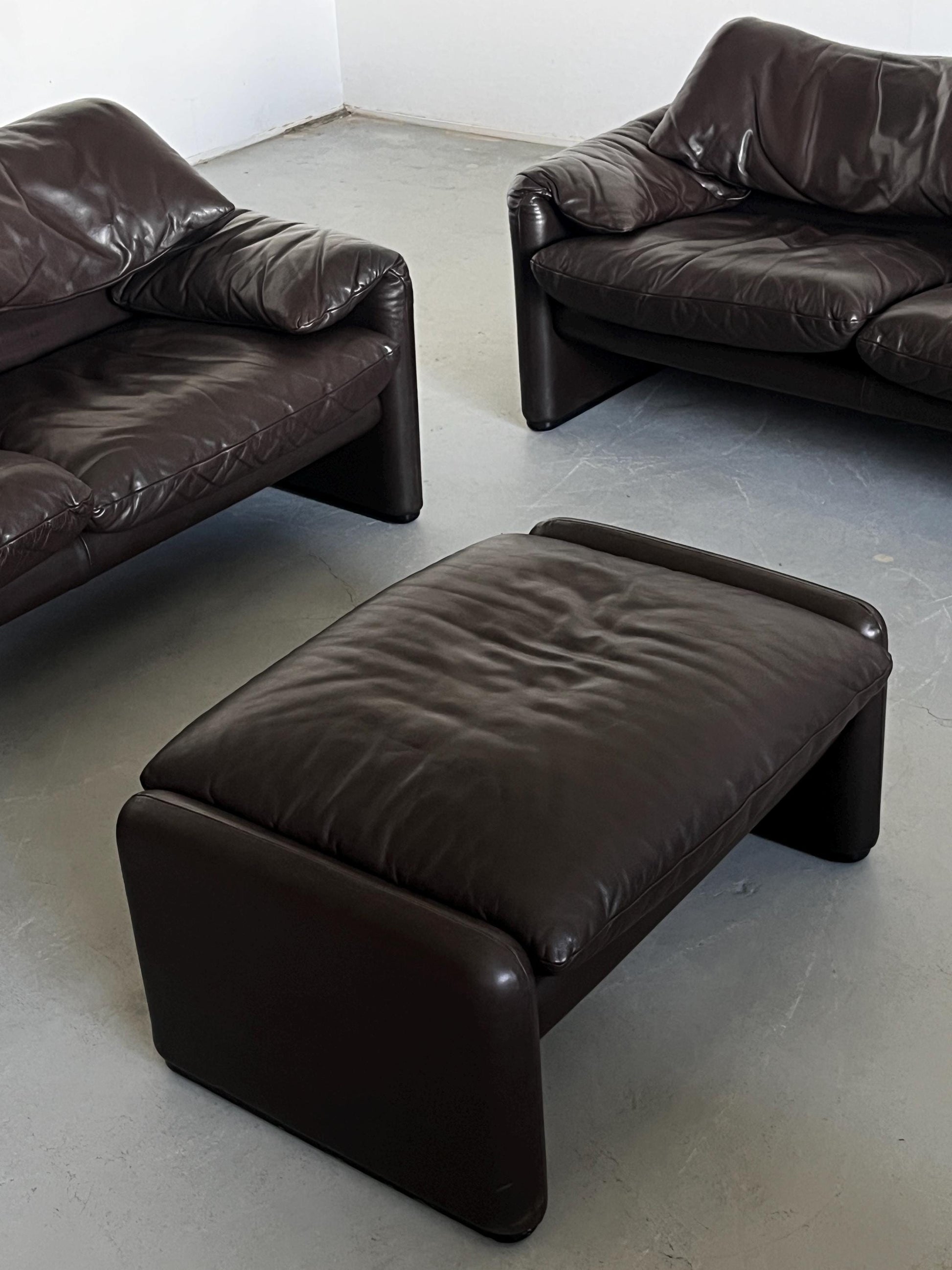 Das Vintage Maralunga Ensemble von Vico Magistretti für Cassina aus den 1970er Jahren ist ein ikonisches Set, das zeitlose Eleganz und außergewöhnlichen Komfort vereint. Das Set besteht aus zwei originalen, dunkelbraunen Zwei-Sitzer-Sofas und einem passenden Ottoman – ein echtes Highlight für Liebhaber von Mid Century Modern und Space Age Design. Vico Magistretti, einer der bedeutendsten italienischen Designer, schuf mit der Maralunga-Serie ein Meisterwerk, das bis heute für seine innovative Form und Funktionalität geschätzt wird. Cassina steht für sehr gute Qualität und höchste Handwerkskunst, was sich in jedem Detail dieses Ensembles widerspiegelt.