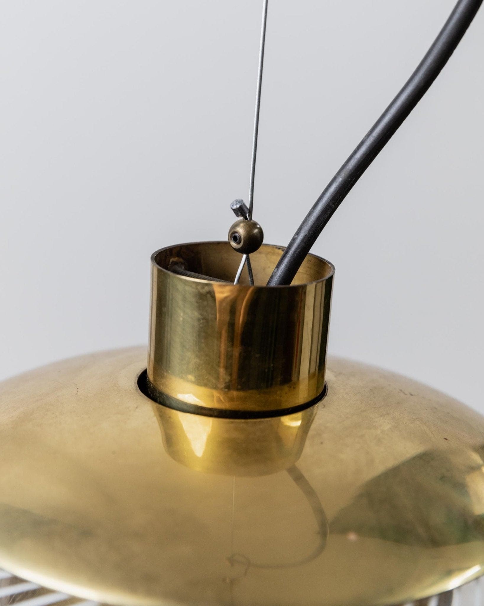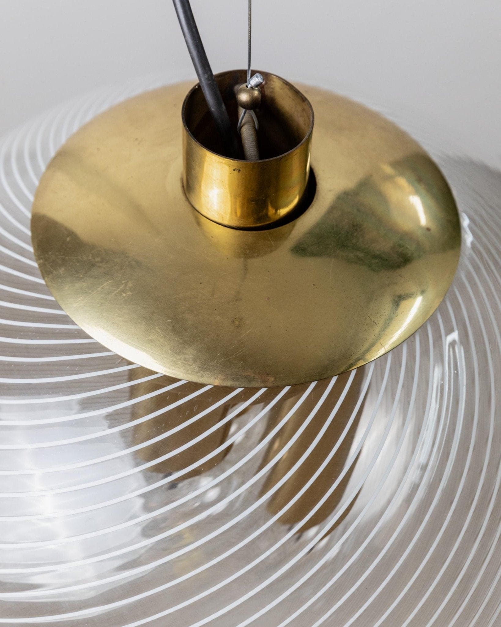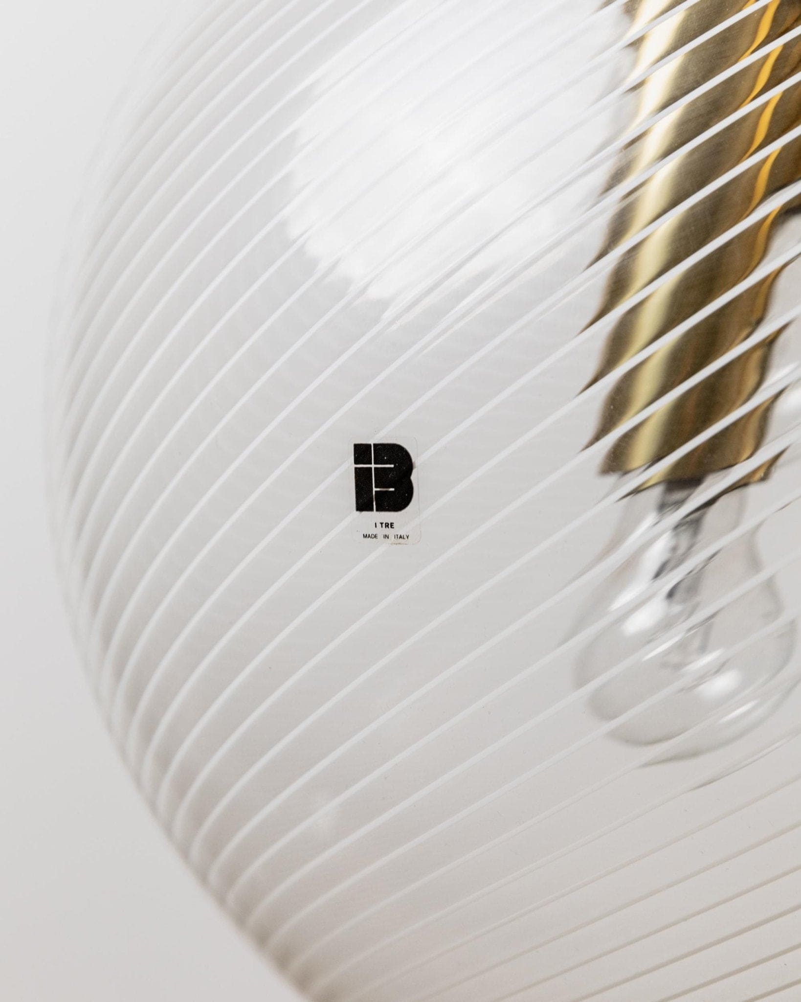 Erlebe die Faszination der Space Age-Ära mit dieser außergewöhnlichen Vintage Murano Glas Globuslampe aus Italien, gefertigt in den 1960er Jahren. Das imposante XXL-Design mit klarem Glaskörper, kunstvoll umhüllt von feinen, weißen Glasfäden, sorgt für ein einzigartiges Lichtspiel und eine warme, einladende Atmosphäre. Die elegante goldfarbene Metallaufhängung und die drei Lichtquellen machen diese Lampe zu einem echten Blickfang und einer perfekten Ergänzung für jedes mid century modern Interieur. Ein Must-have für Liebhaber von sehr guter Qualität und italienischer Glaskunst.