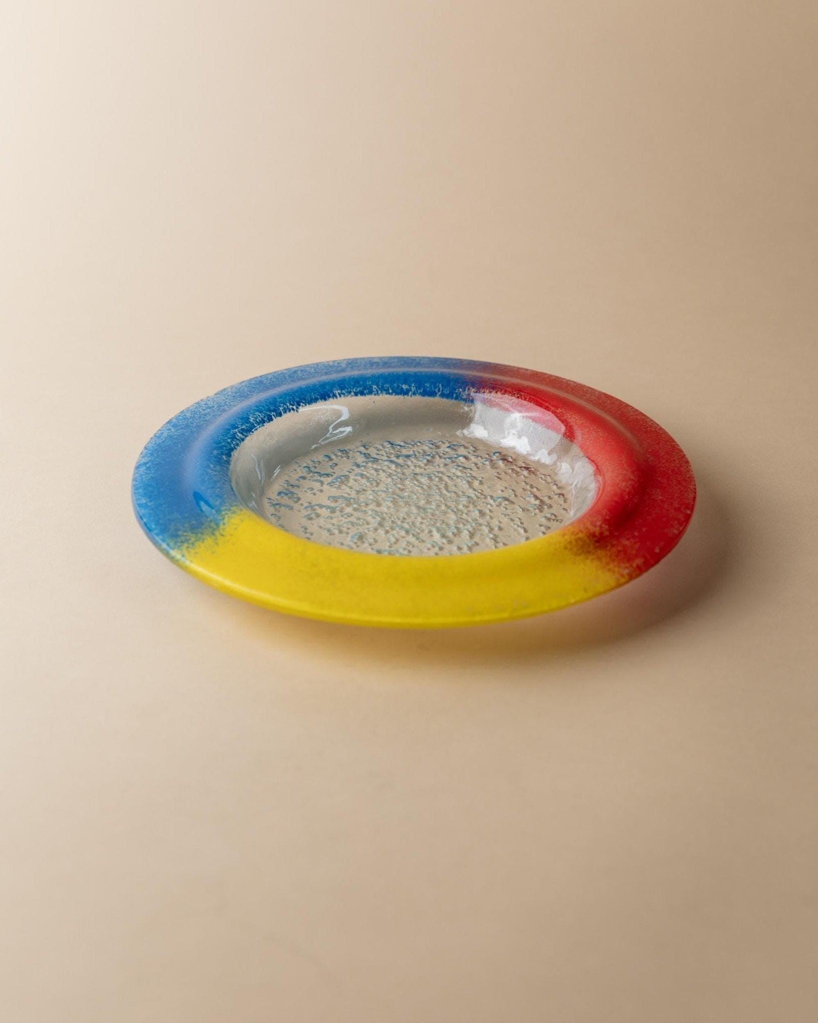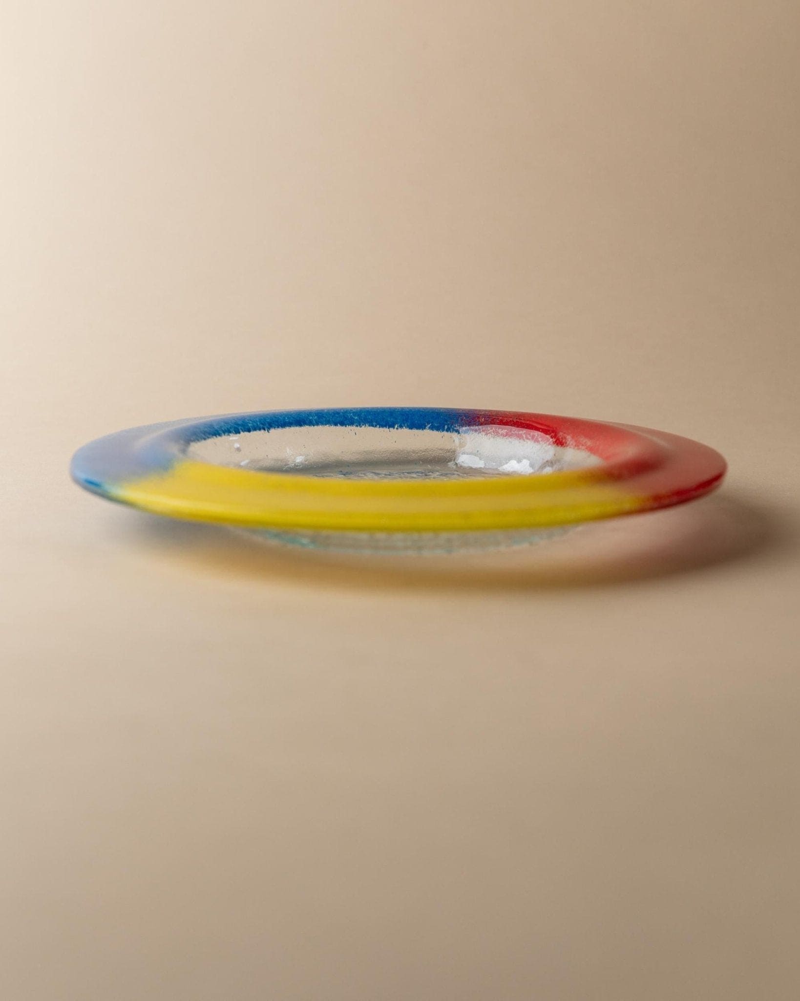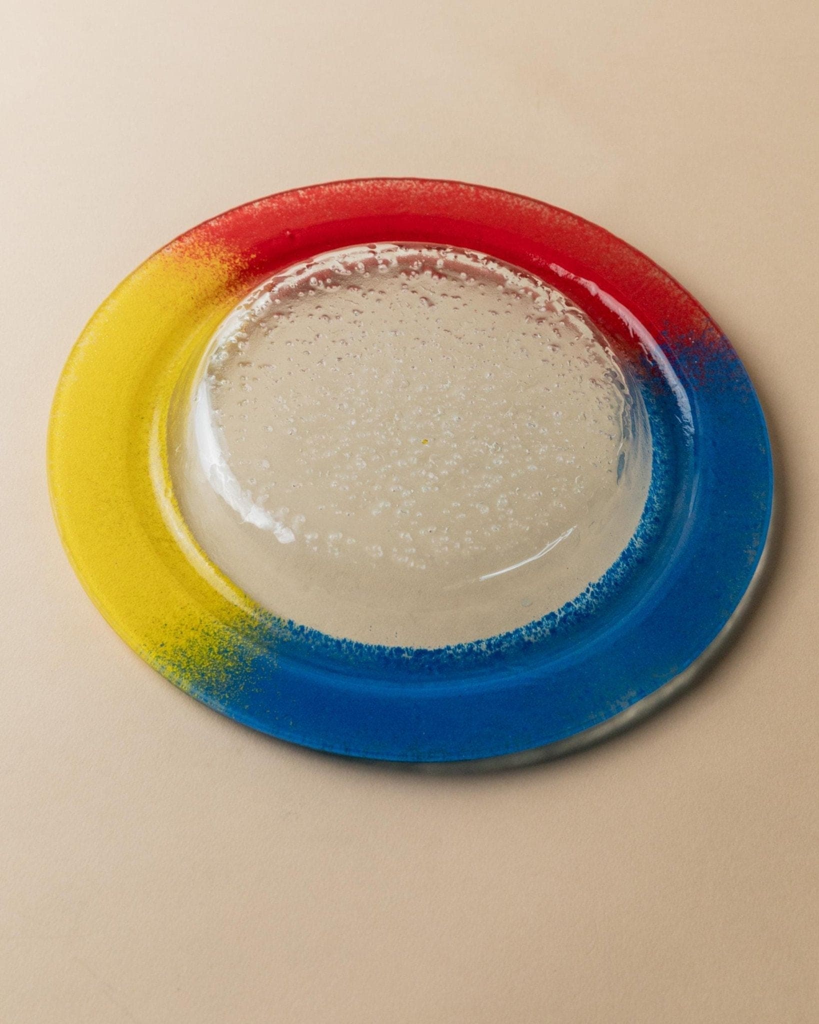 - Skulpturale, flache Form mit klarem Glaszentrum und farbigem Rand in Blau, Rot und Gelb