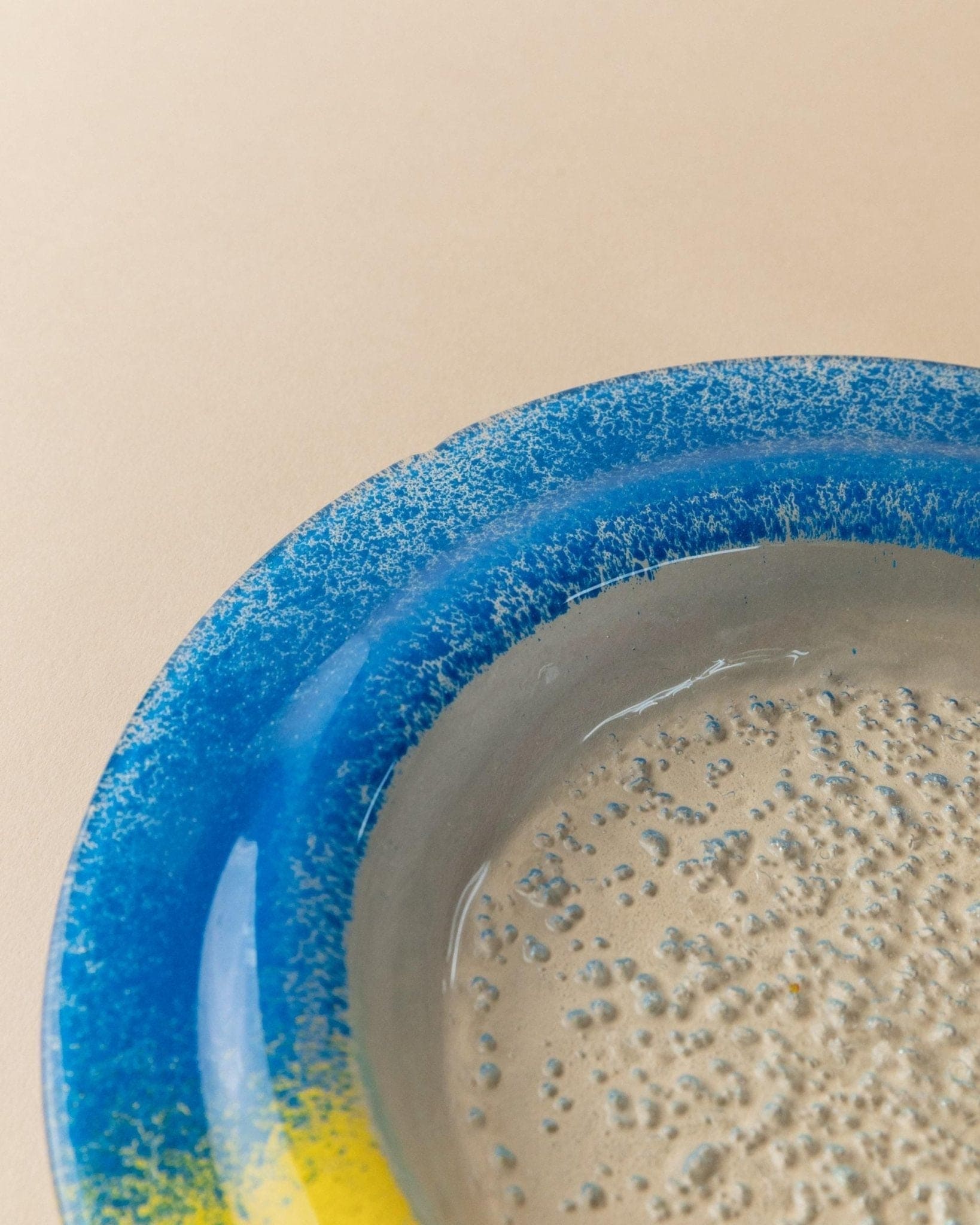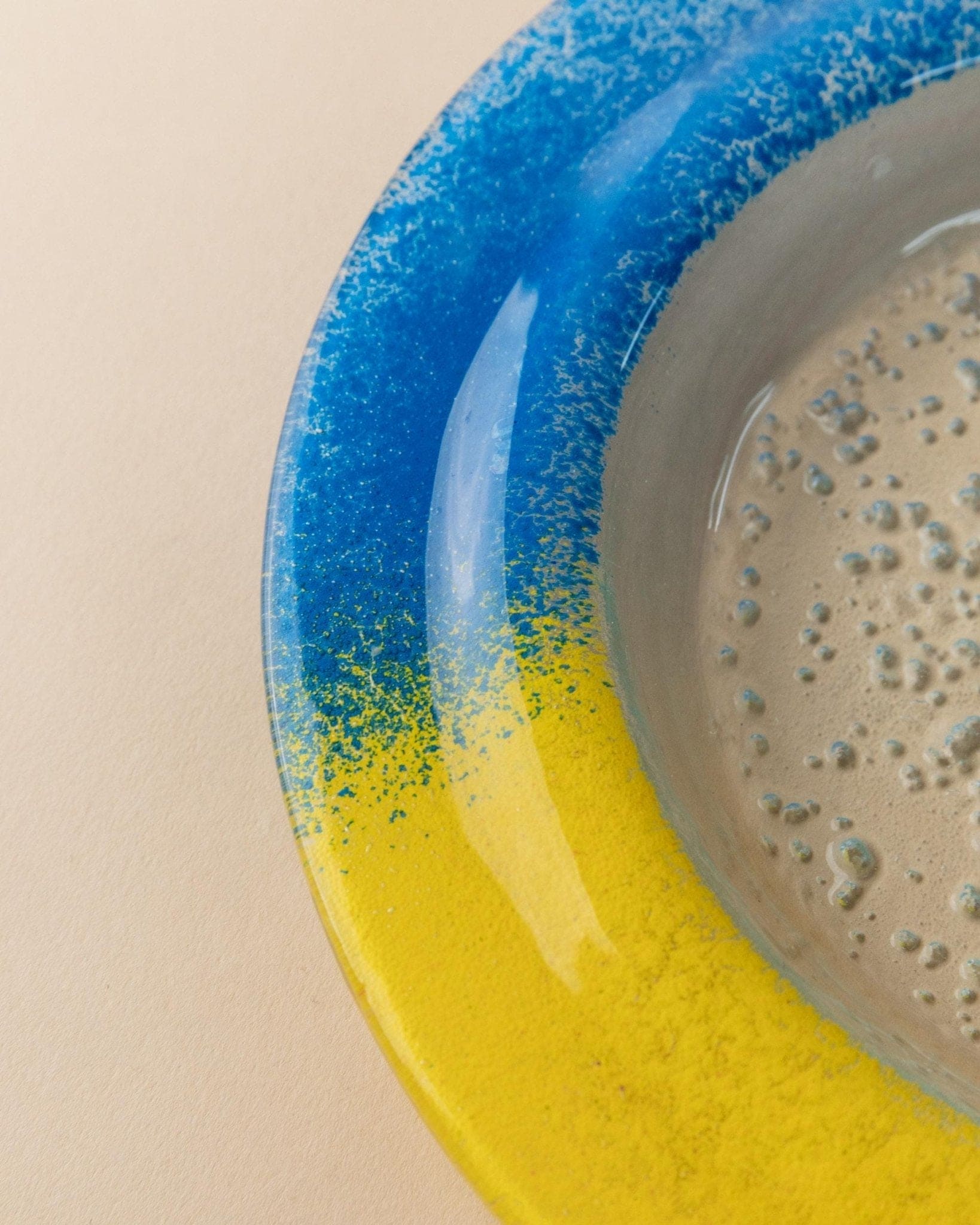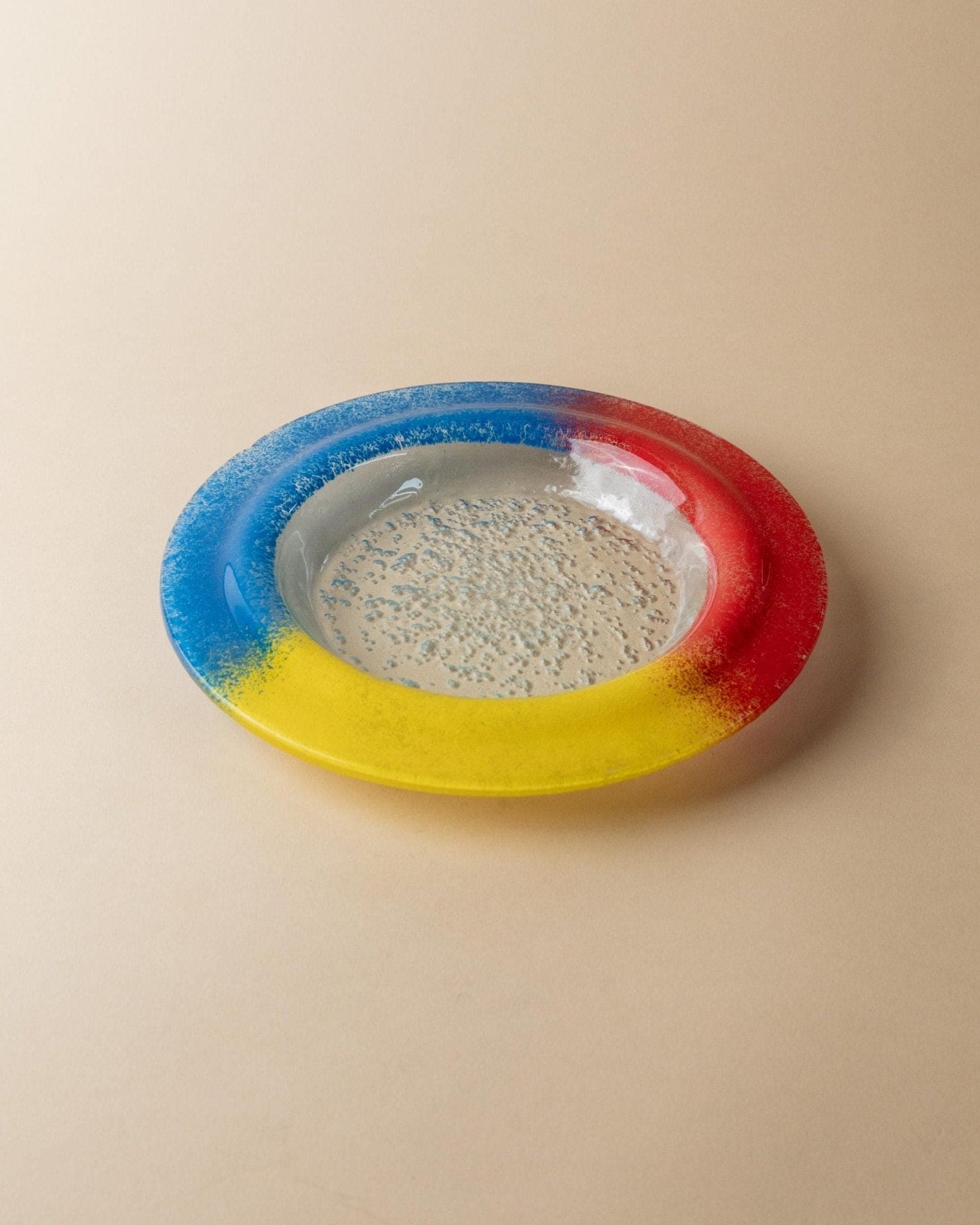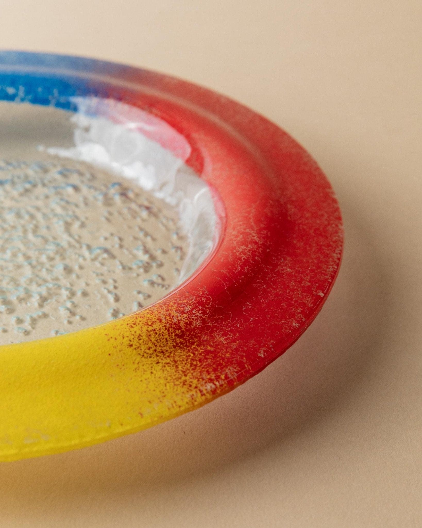 - Skulpturale, flache Form mit klarem Glaszentrum und farbigem Rand in Blau, Rot und Gelb