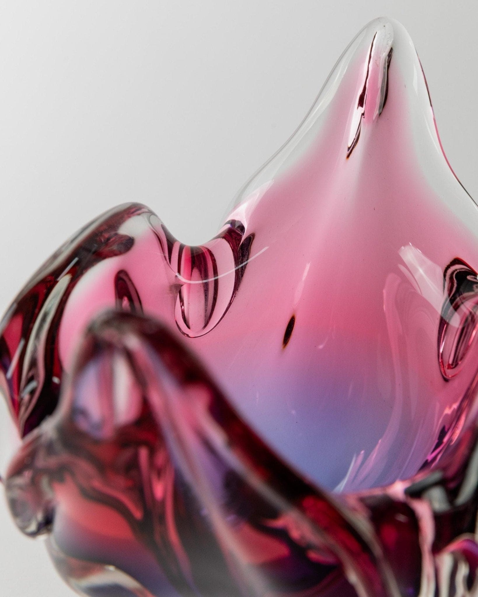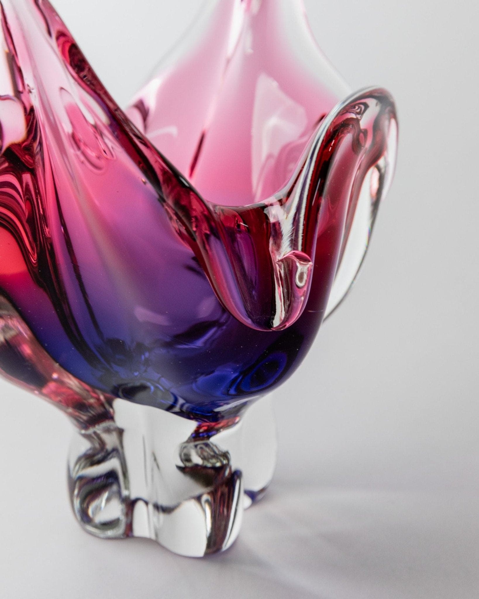 Entdecke die faszinierende Welt des Mid Century Modern Designs mit dieser Vintage Murano Glasschale aus den 1970er Jahren. Die organische Form mit ihren eleganten, spitz zulaufenden Kanten und dem sanften Farbverlauf von klarem Glas zu kräftigem Blau und Rosa macht dieses Stück zu einem echten Blickfang. Die Schale vereint Space Age Ästhetik mit italienischer Handwerkskunst und eignet sich sowohl als stilvolle Obstschale als auch als begehrtes Sammlerobjekt. Ein edles Geschenk für Designliebhaber und ein einzigartiges Statement auf jedem Tisch.