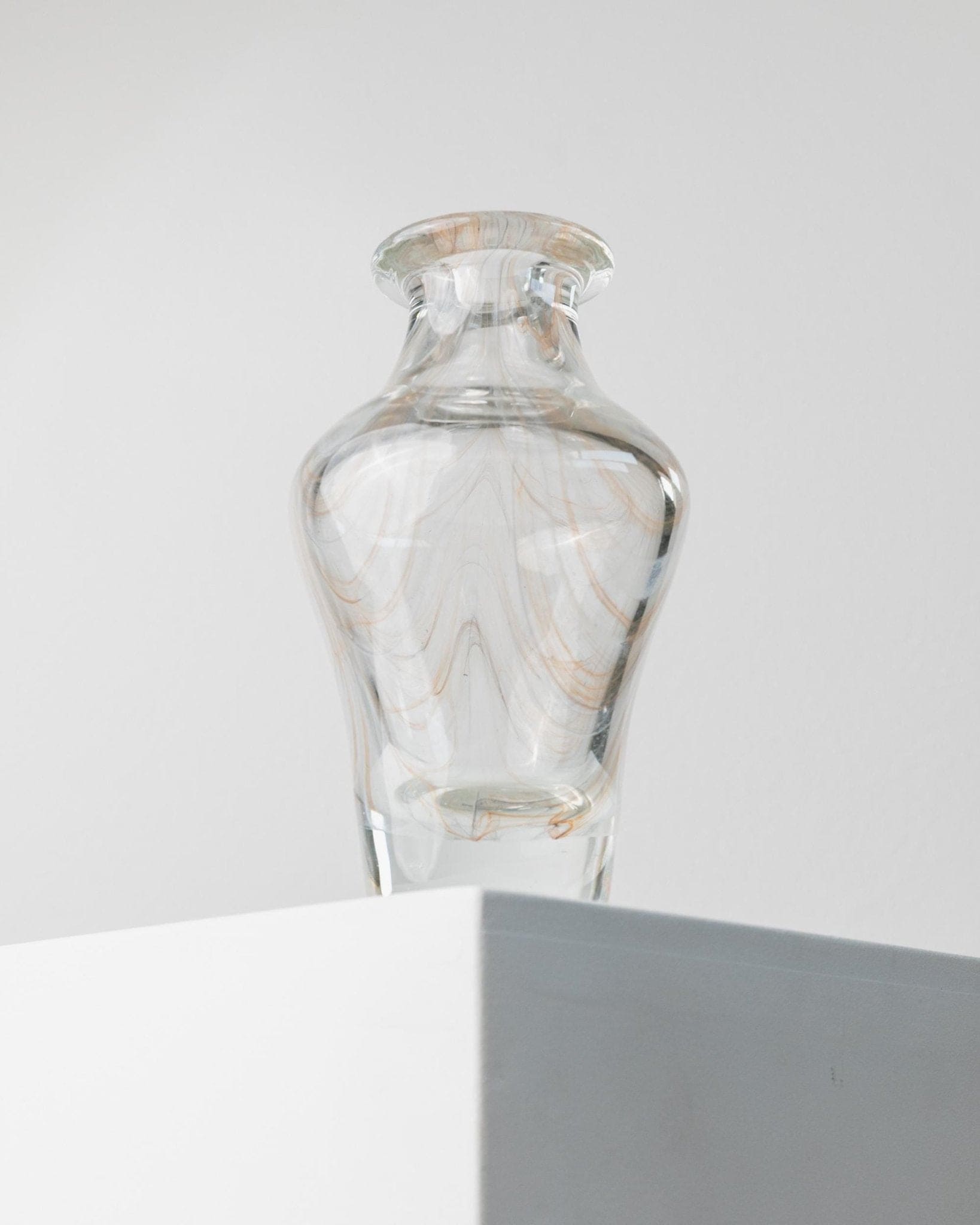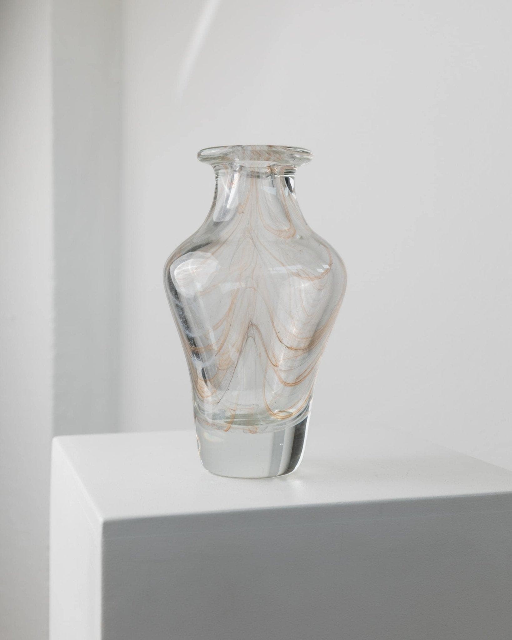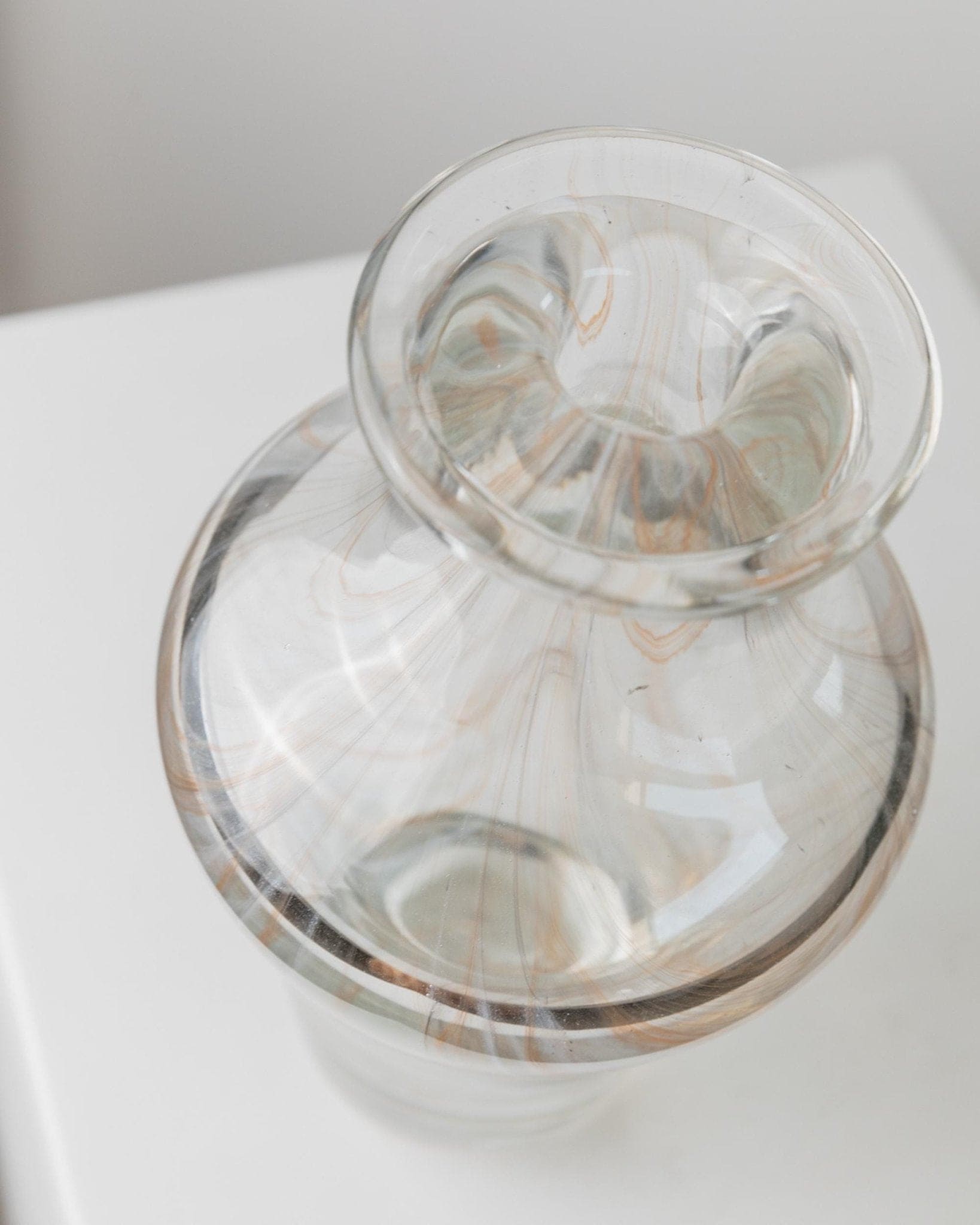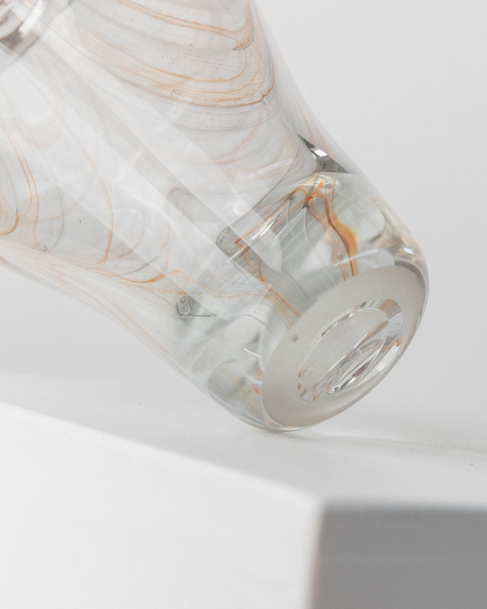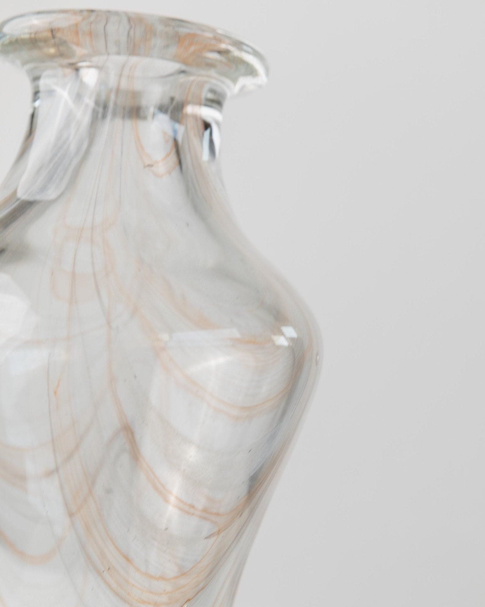 - Material: Schweres, klares Glas mit beige-weißen Wirbeln