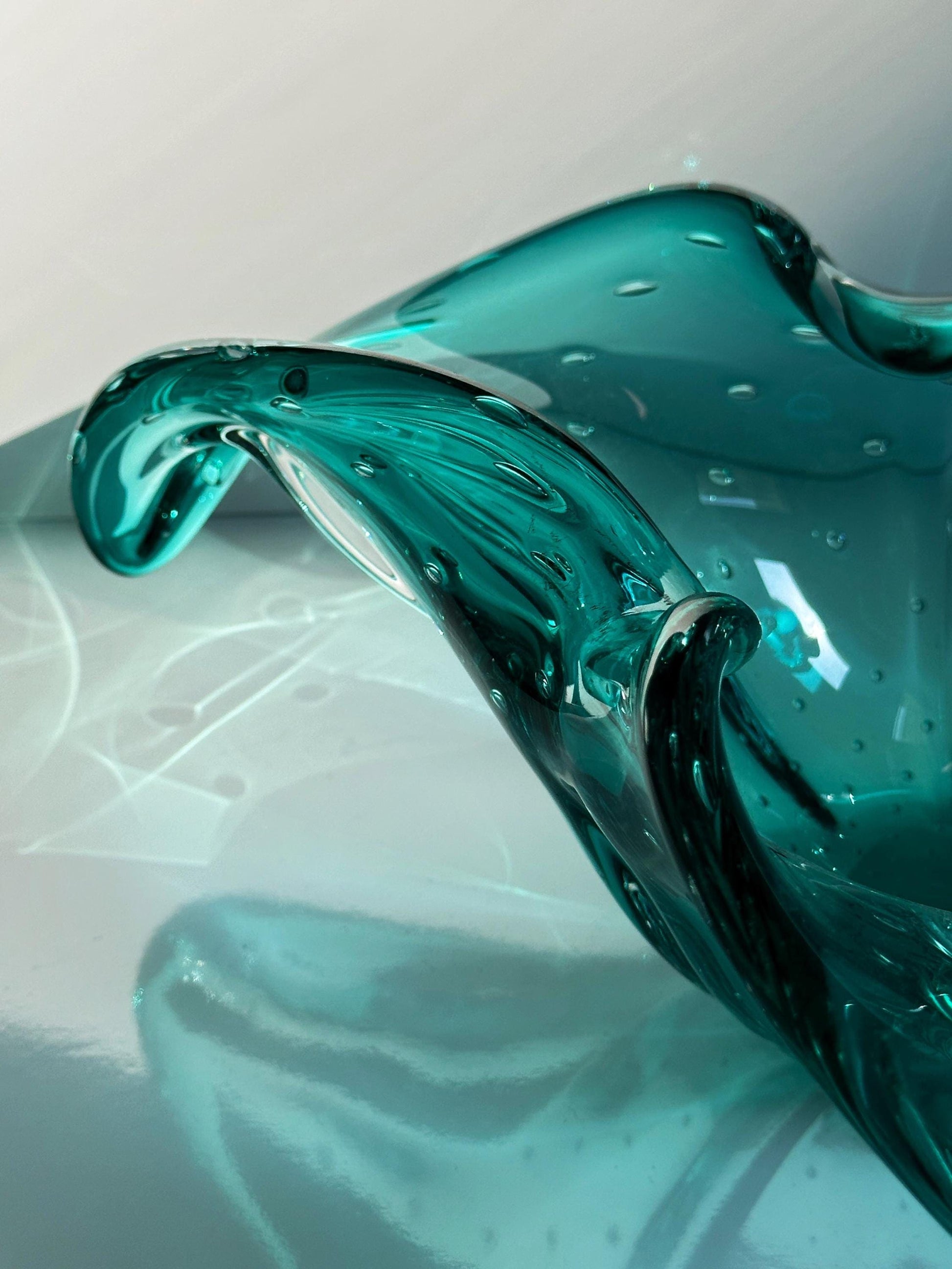 Tauche ein in die faszinierende Welt des italienischen Designs mit dieser außergewöhnlichen Vintage Obstschale aus Murano Glas von Barovier Toso. Die Schale besticht durch ihr seltenes Mintgrün/Türkis, das in dieser Nuance nur schwer zu finden ist. Die kunstvolle Bullicante-Technik mit den charakteristischen Blasen verleiht dem Stück eine besondere Tiefe und Eleganz. Ein echtes Highlight für Liebhaber von Mid Century Modern und Space Age Design, das jedem Raum einen Hauch von Luxus verleiht.