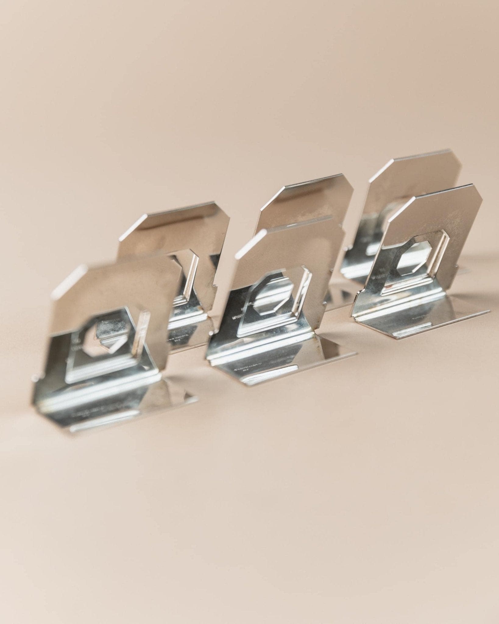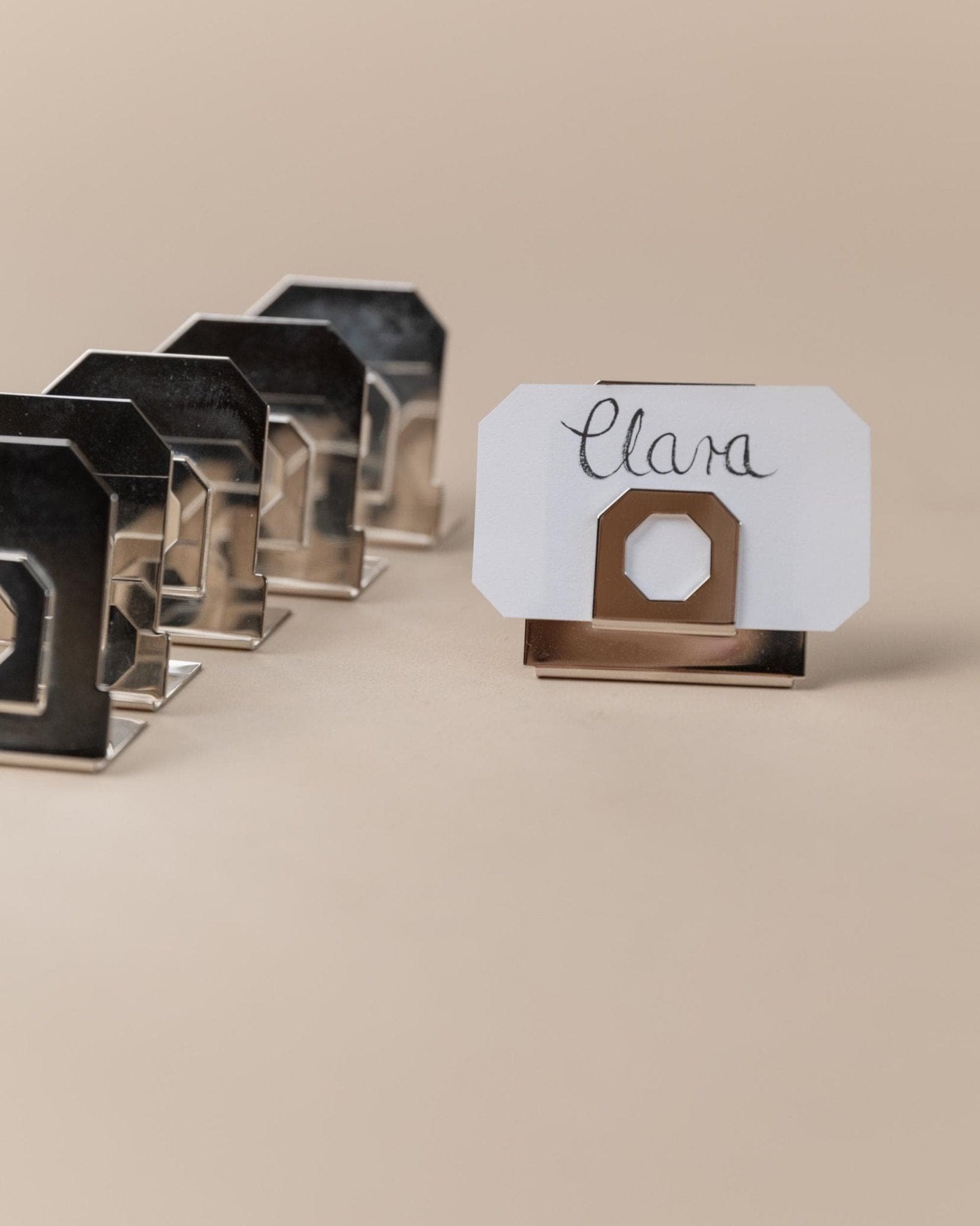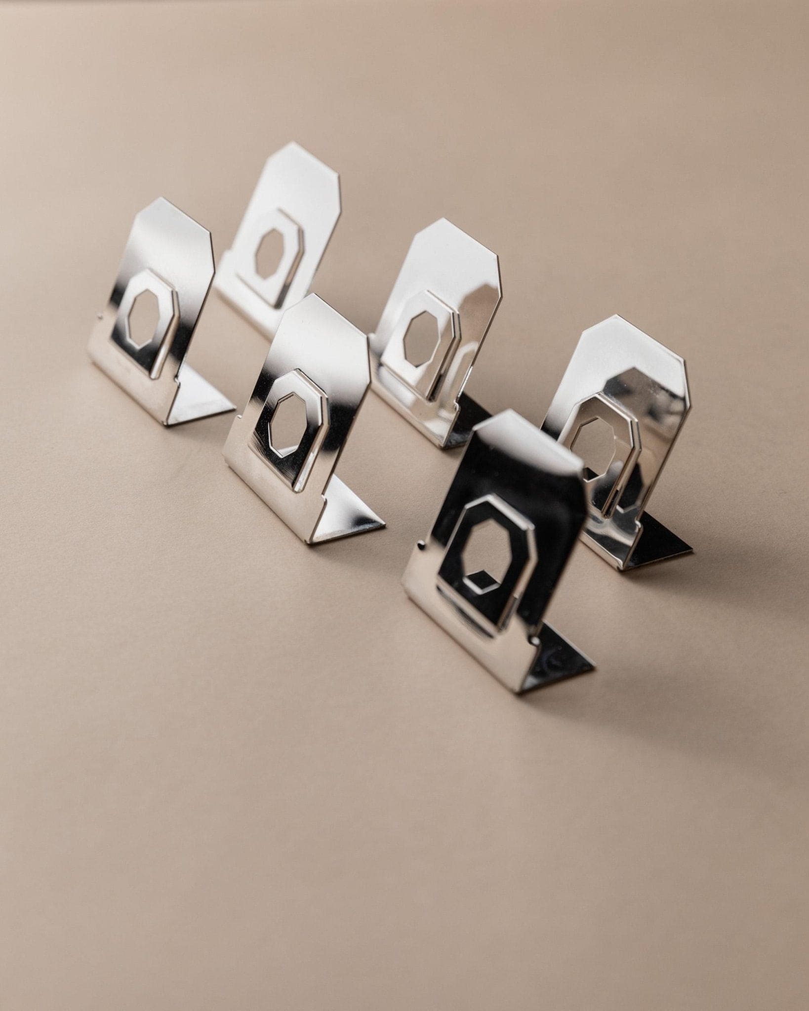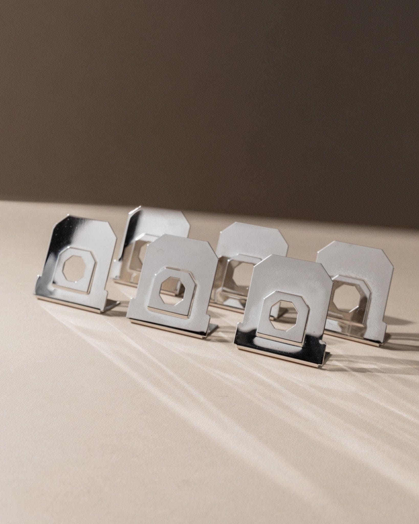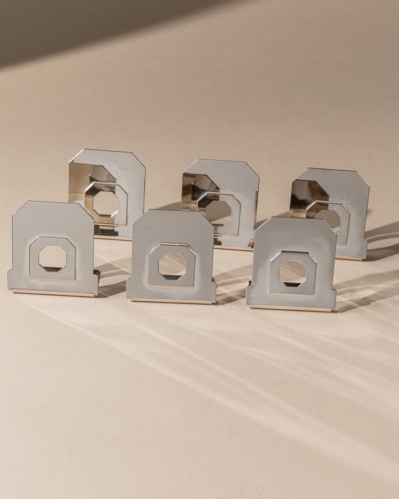 Entdecke dieses exklusive Set aus 6 Vintage Platzkartenhaltern, gefertigt in Italien in den 1980er Jahren. Die versilberte Oberfläche und das dezente, achteckige Cut-Out-Design verleihen jedem Tisch eine elegante, zeitlose Note. Inspiriert vom Mid Century Modern und Space Age Stil, vereinen diese Platzkartenhalter klassische Raffinesse mit moderner Geometrie. Perfekt für festliche Dinner, Hochzeiten oder als stilvolles Geschenk – sie setzen ein edles Statement auf jeder Tafel.