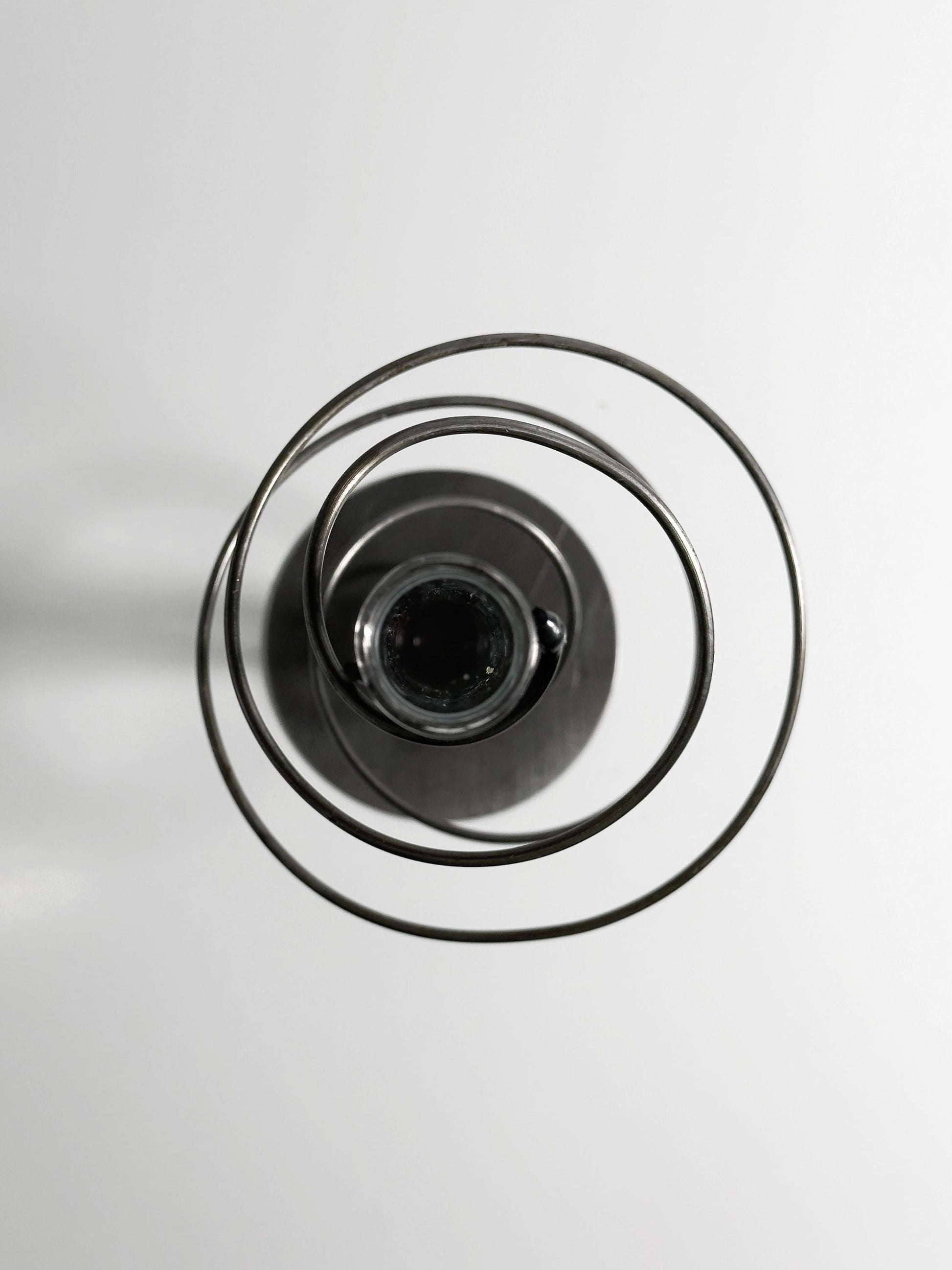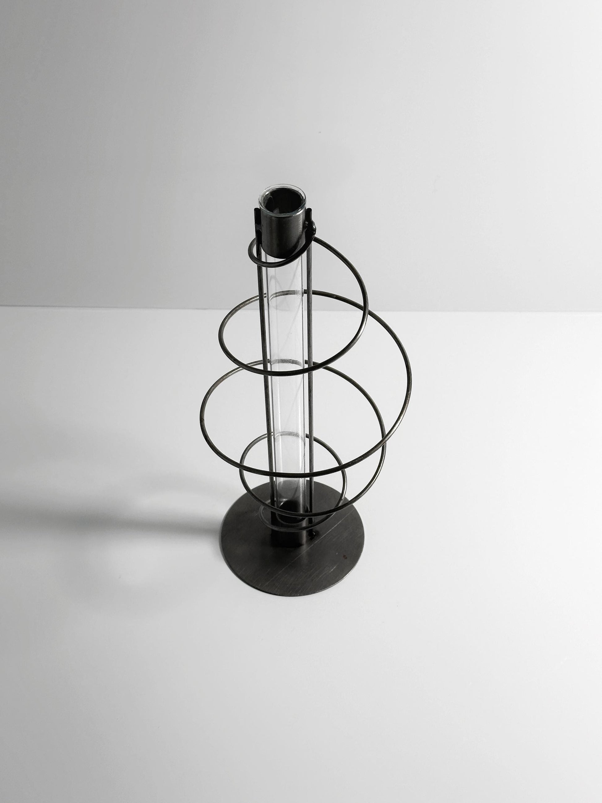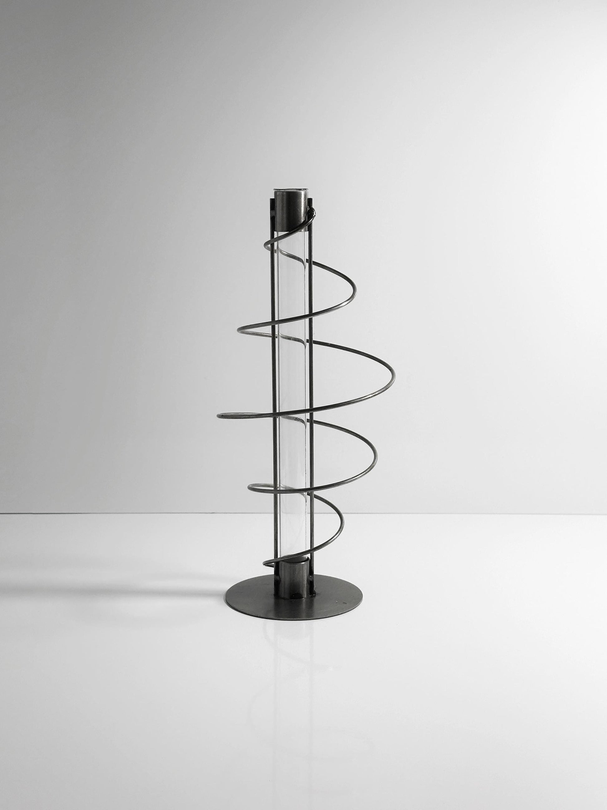 Entdecke die außergewöhnliche Vintage Postmodern Glas Metall Solifleur Blumenvase im Memphis Milano Stil aus den 1990er Jahren, gefertigt in Deutschland. Diese Vase vereint den ikonischen Space Age Look mit mid century modern Elementen und ist ein echtes Highlight für Designliebhaber. Das Design besticht durch einen klaren Glaszylinder, der von einer kunstvoll spiralförmigen Metallfassung umgeben wird – ein echter Hingucker für jedes Interieur. Die Vase stammt aus einer Zeit, in der mutige Formen und innovative Materialien das Design prägten.