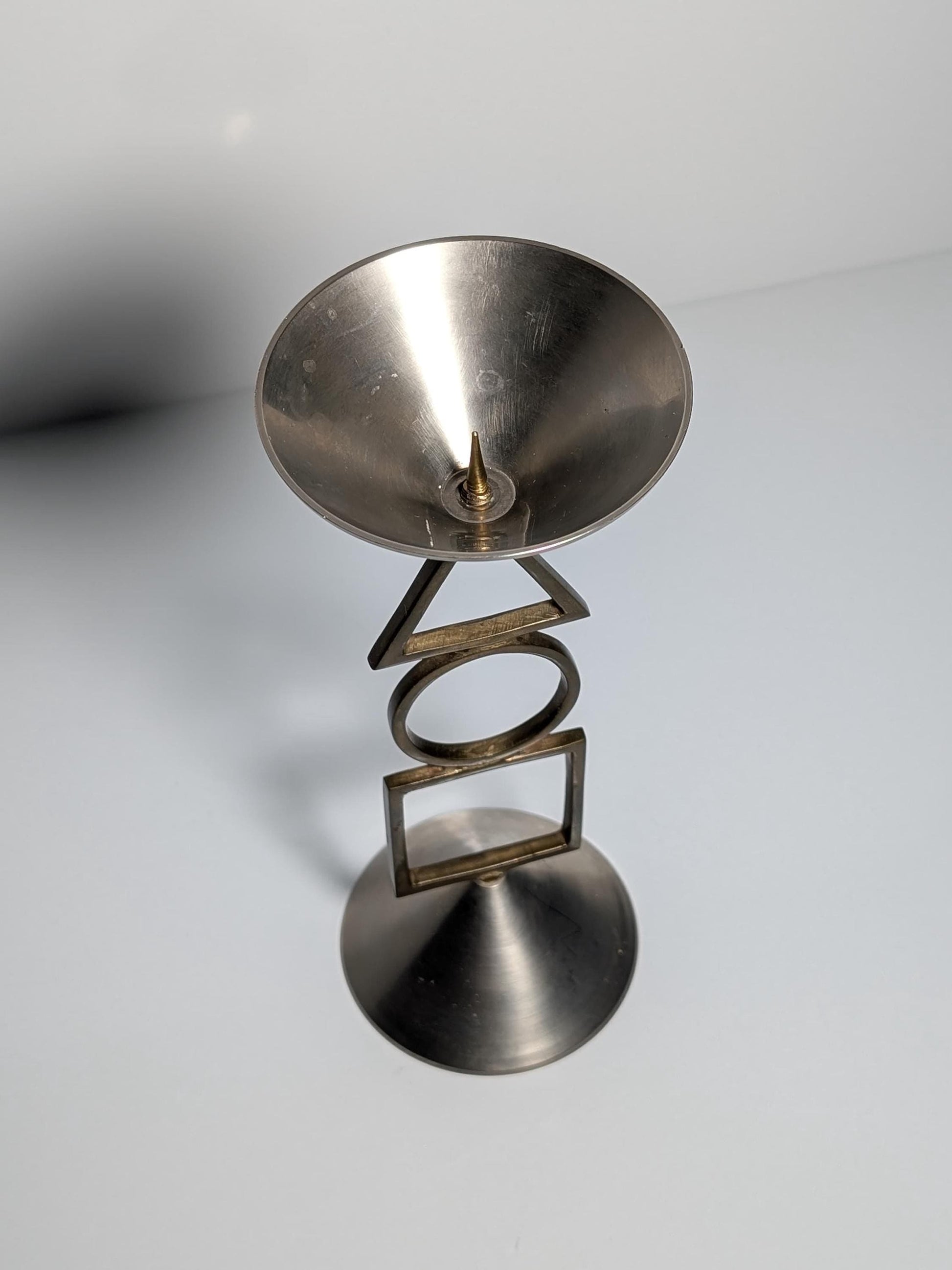 Entdecke einen außergewöhnlichen Vintage Kerzenhalter im postmodernen Memphis Milano Stil, der die Ästhetik der späten 80er und frühen 90er Jahre perfekt einfängt. Das Design besticht durch seine geometrischen Formen und die Kombination aus silberfarbenem Metall und eleganten Messingakzenten. Dieser Kerzenleuchter ist ein echtes Statement-Piece für Liebhaber von Space Age und mid century modern Design. Die sehr gute Qualität und die charakteristische Patina verleihen dem Stück einen einzigartigen Charme.