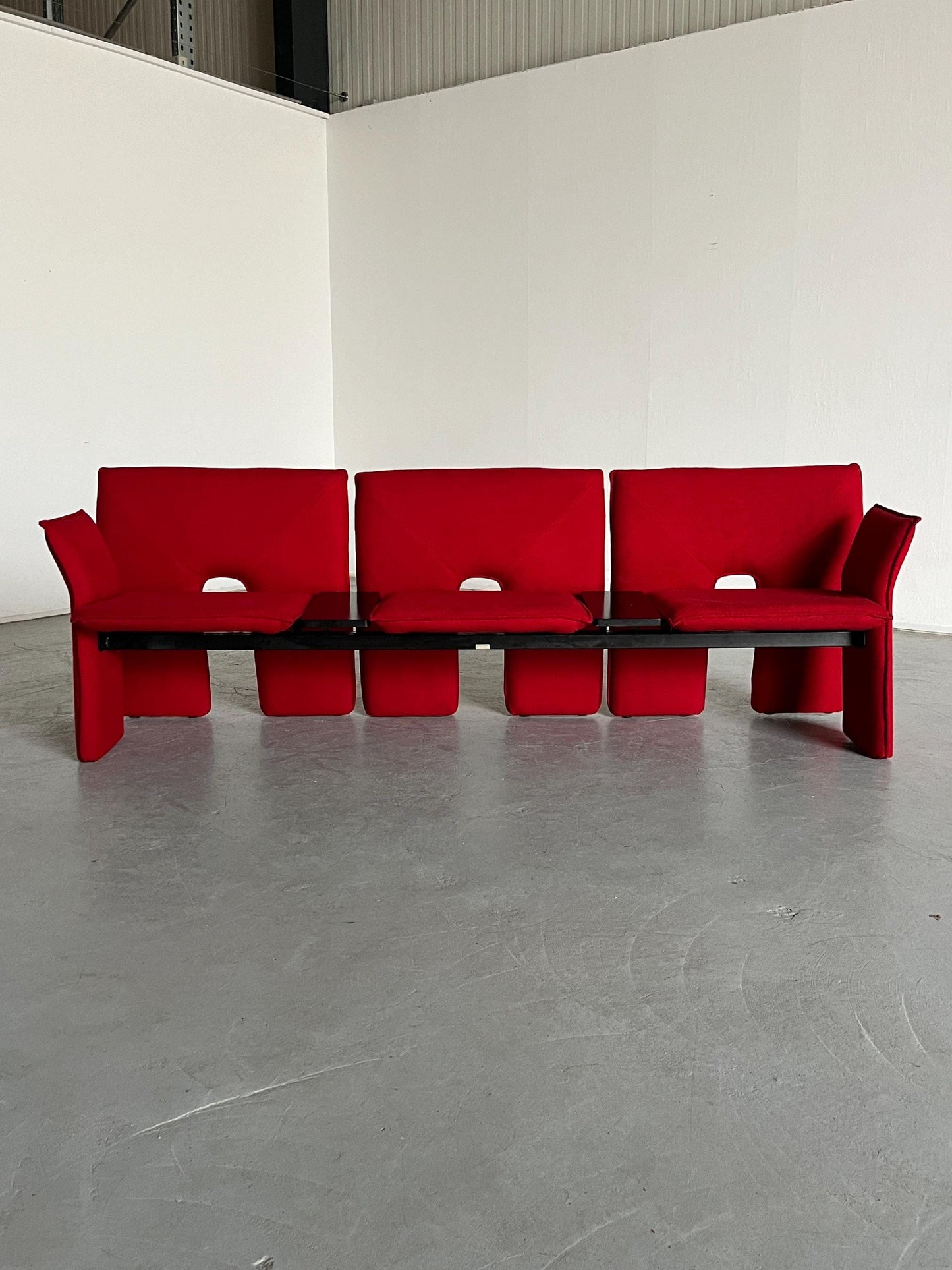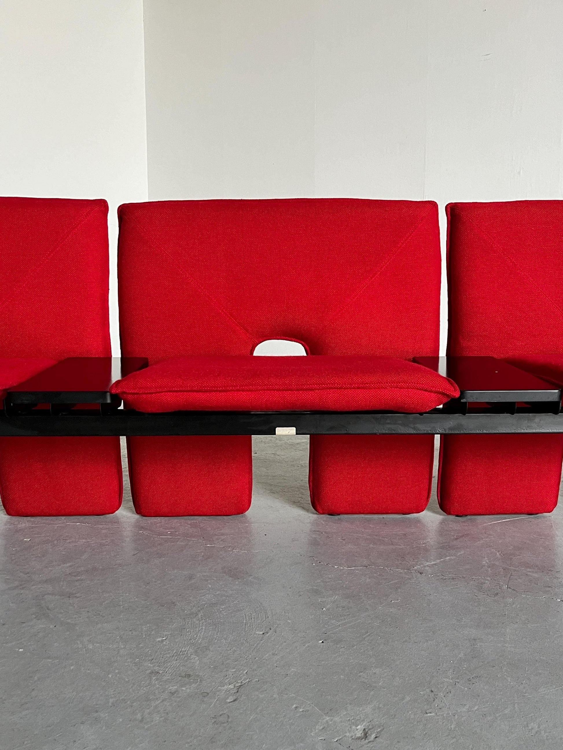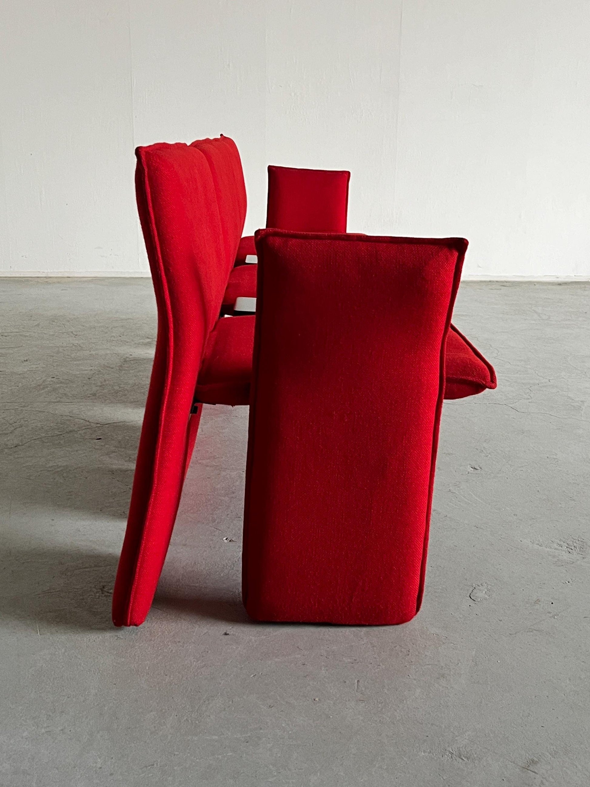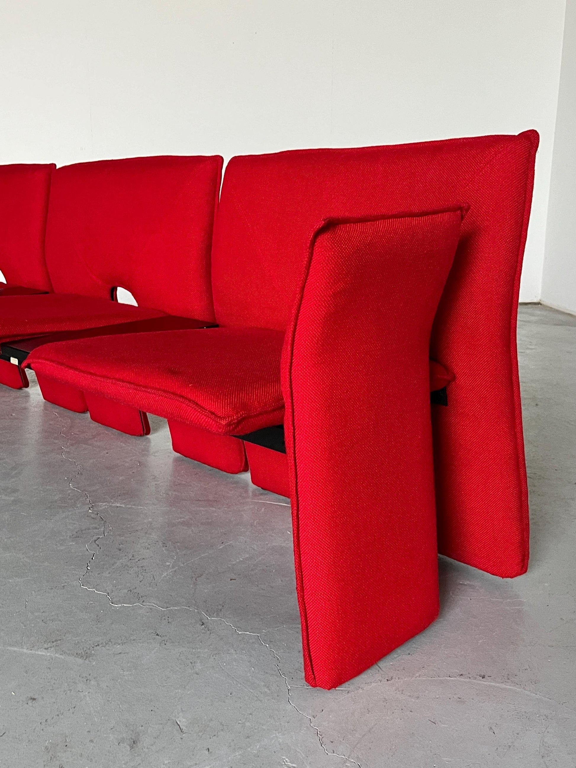 Vintage Dreisitzer-Sofa rotes Wollbezug schwarzes Metall Memphis-Stil 1980er Italien