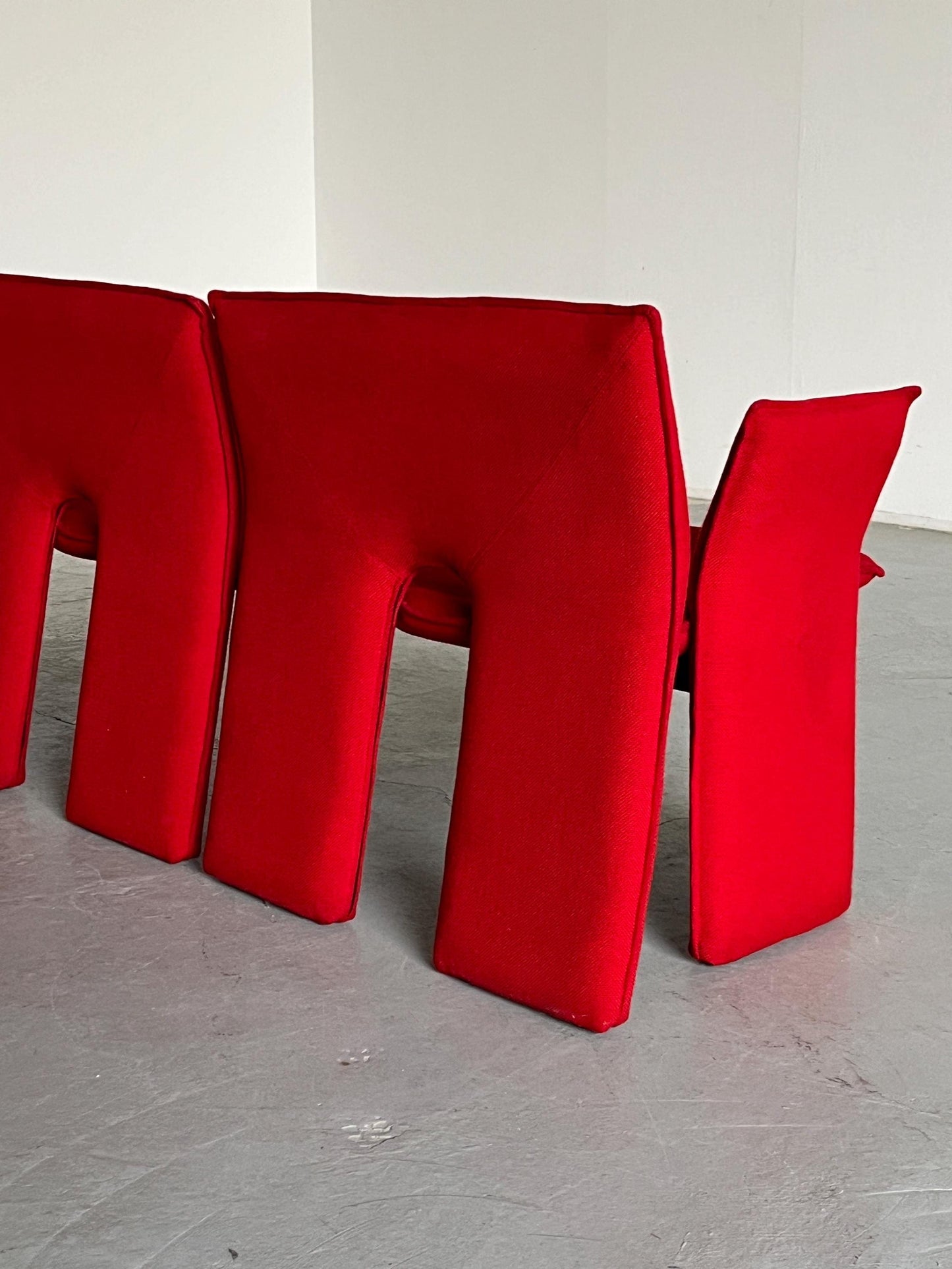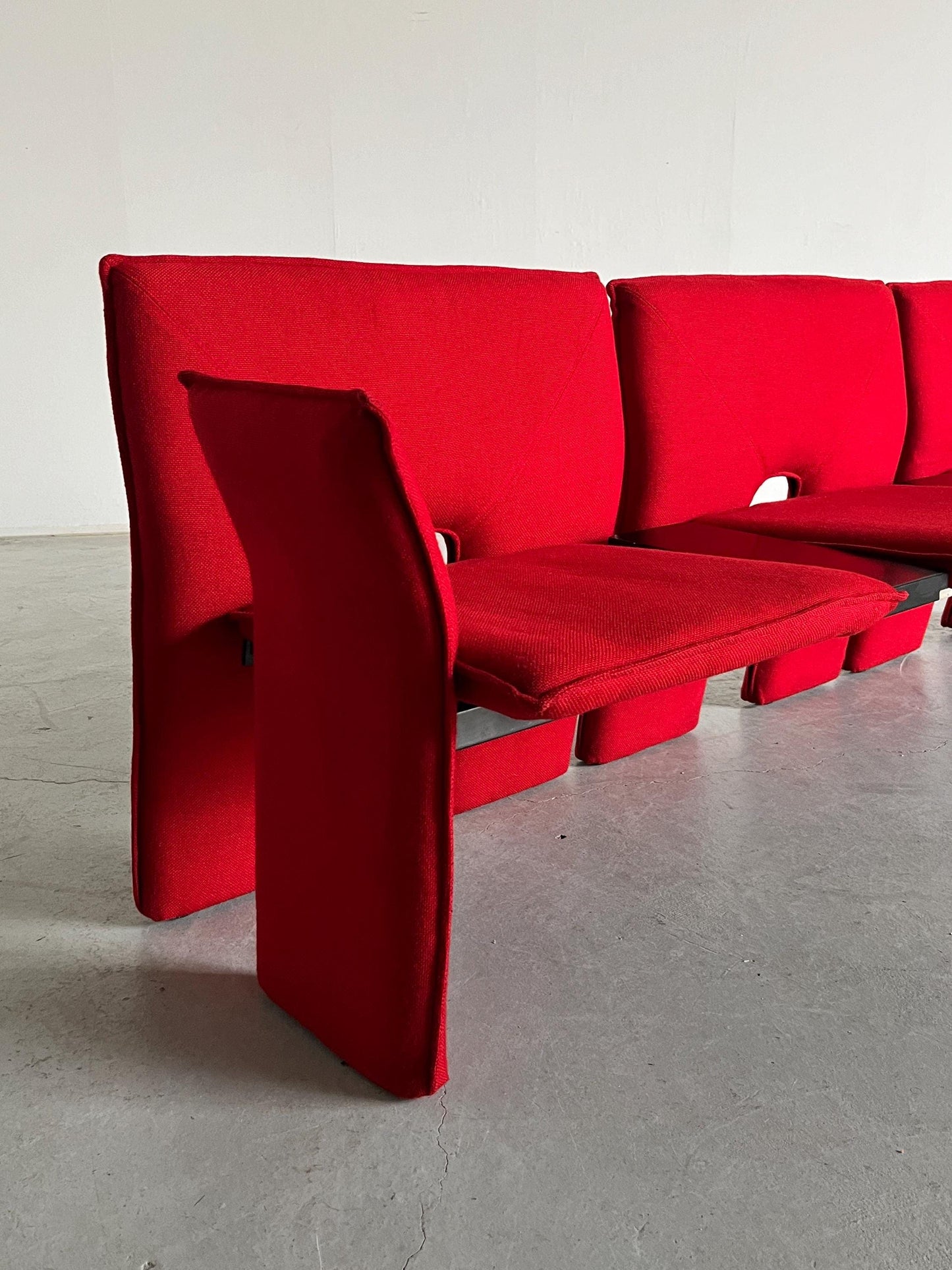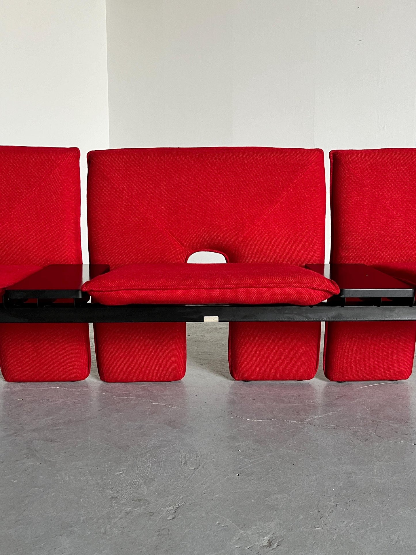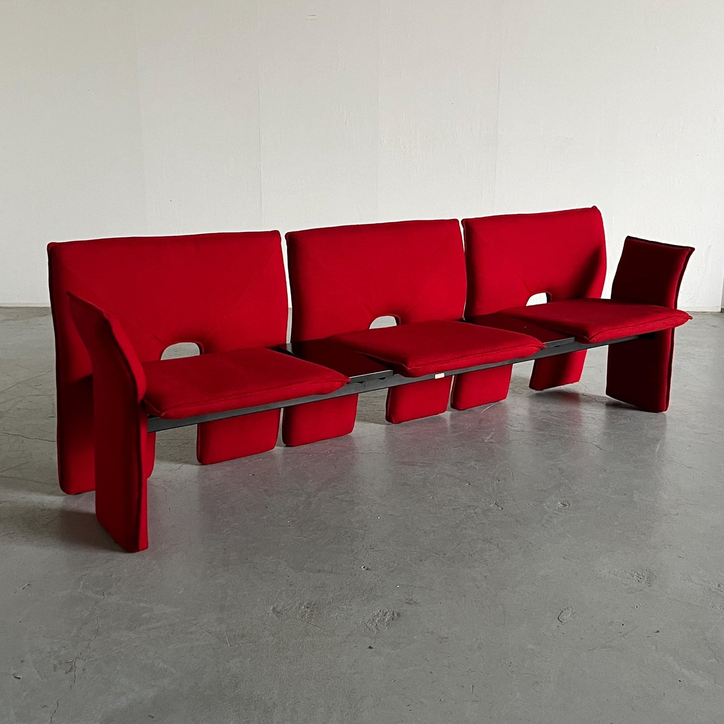 Vintage Dreisitzer-Sofa rotes Wollbezug schwarzes Metall Memphis-Stil 1980er Italien