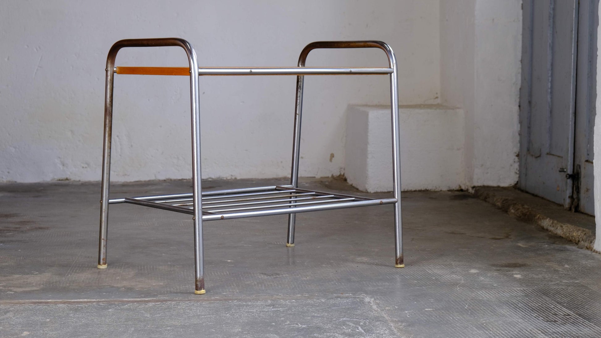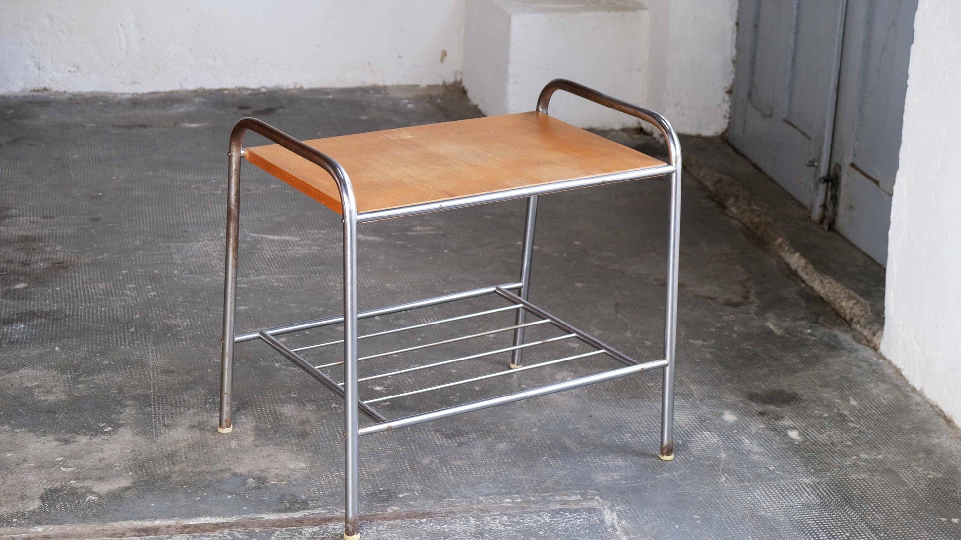 Stahlrohr Beistelltisch mit hellbrauner Holzablage mit einigen Gebrauchsspuren. Die Verchromung ist nicht mehr vollständig erhalten und weist stellenweise starke Korrosionsspuren auf (s. Foto). Die Holzablage ist gut erhalten und zeigt übliche Gebrauchsspuren.