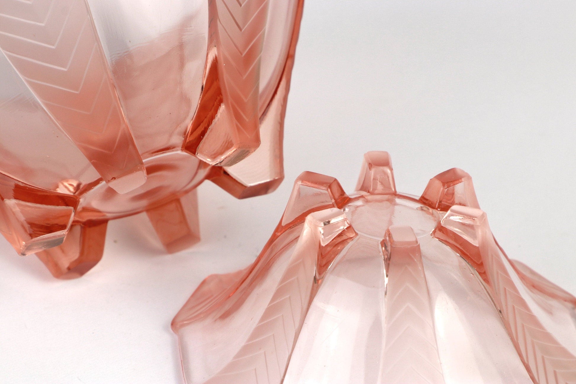 - Zartes Rosalin Glas mit geometrischen Art Deco Verzierungen