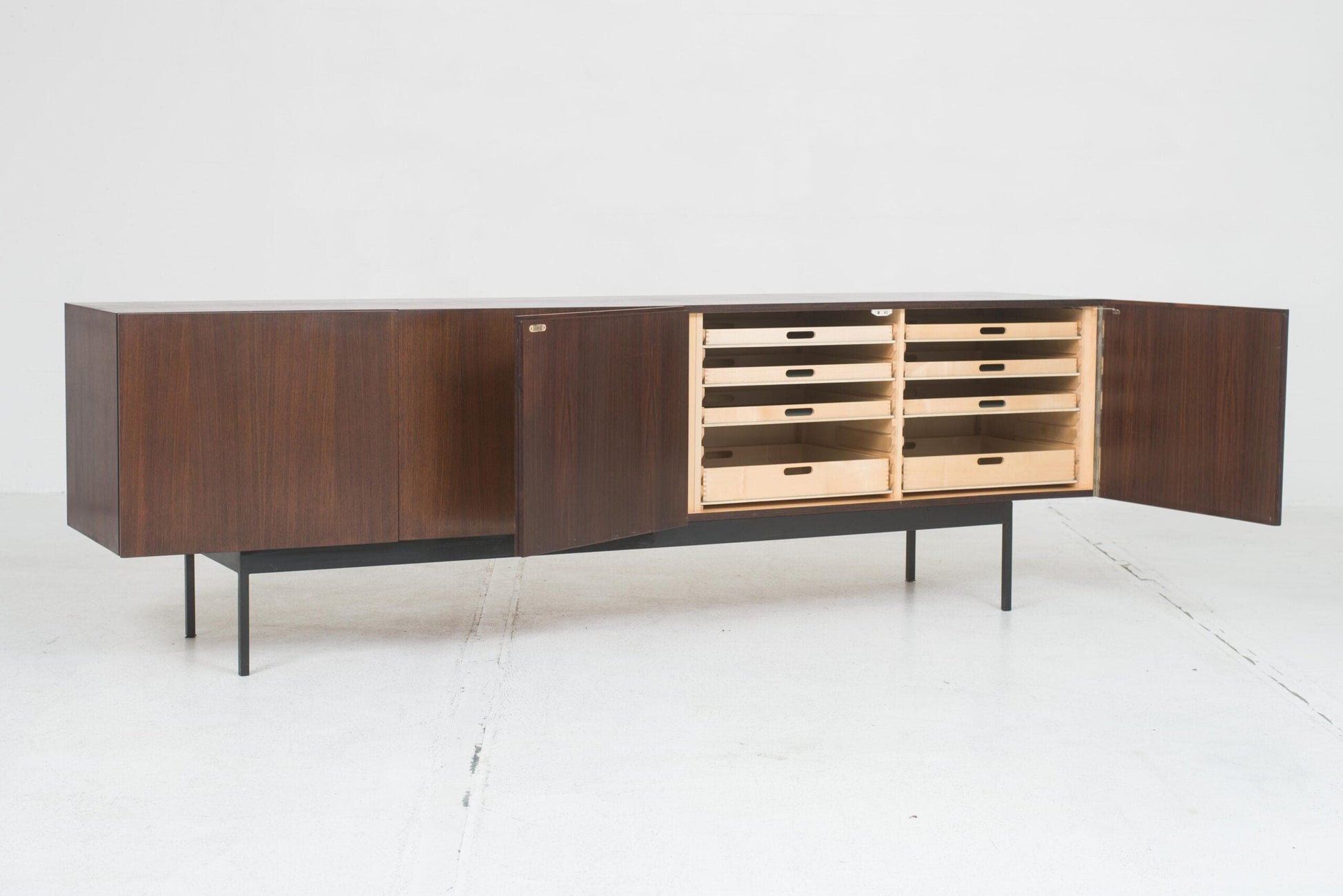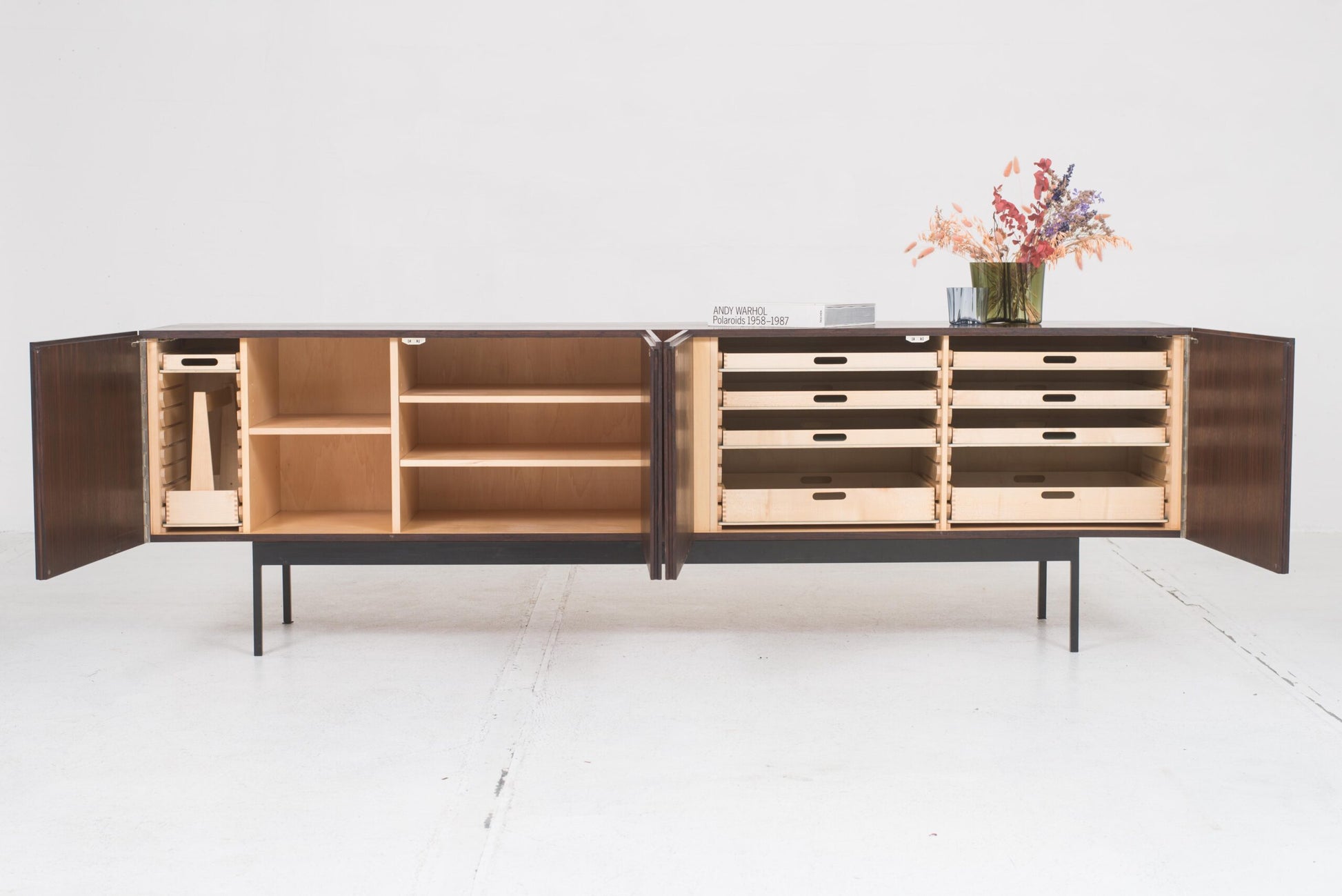Dieses Sideboard ist nicht nur ein funktionales Möbelstück, sondern auch ein Kunstwerk, das jedem Raum einen Hauch von Eleganz verleiht. Die hochwertige Verarbeitung und das edle Palisanderholz machen es zu einem langlebigen Begleiter. Perfekt für alle, die Wert auf Qualität und Design legen.