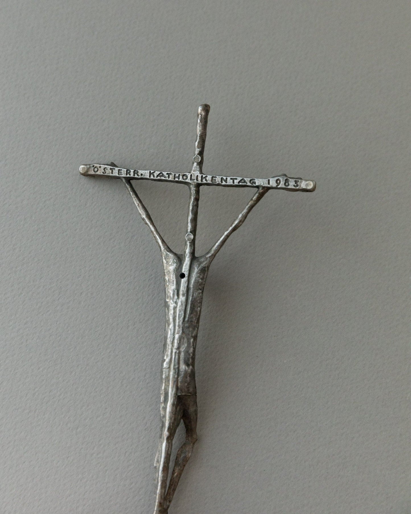 Vintage Skulptur Jesus am Kreuz von E. Huber für Austrian Catholic Day 1983