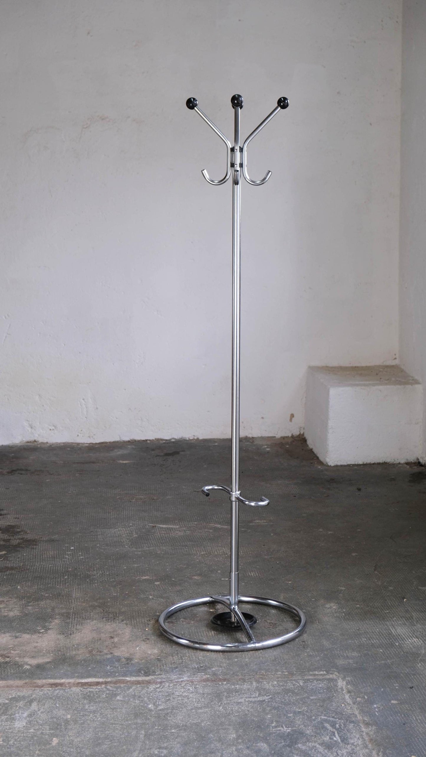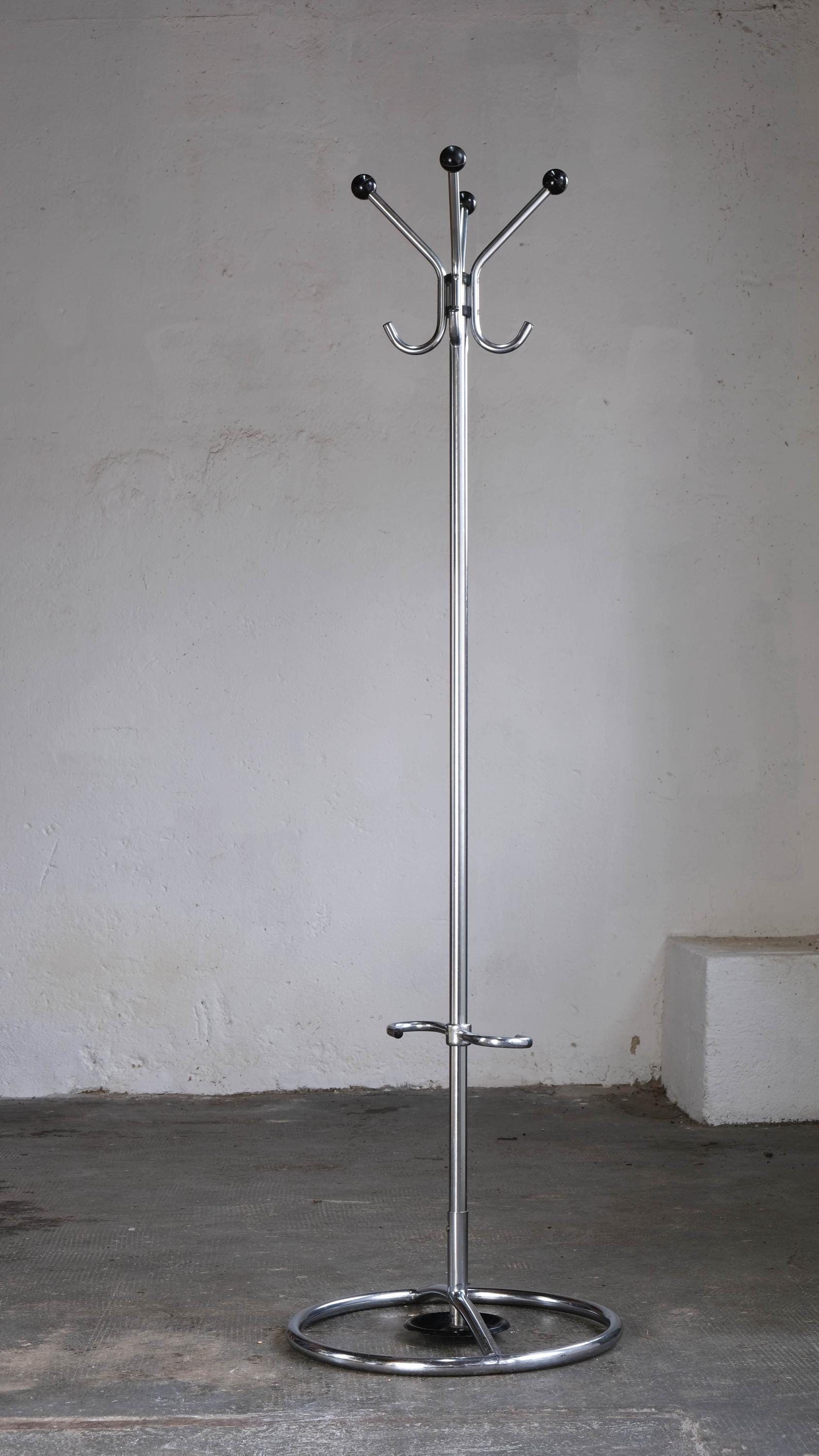 Standgarderobe im Bauhaus Design, vermutlich aus den 40er Jahren, mit schwarzem Schirmständer aus Metall. Die Verchromung zeigt einen schönen Glanz, weist aber Korrosionsschäden und Kratzer auf, wie auf den Fotos zu erkennen ist.