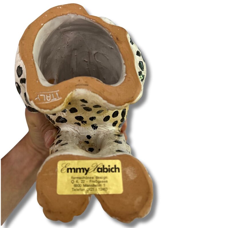 Ein Hauch von Wildnis und italienischem Charme – dieser handbemalte Baby-Leopard aus Terrakotta bringt die 1970er Jahre direkt in Dein Zuhause. Ein einzigartiges Vintage-Stück, das mit seiner detailreichen Gestaltung und dem unverwechselbaren Stil begeistert. Die kunstvolle Glasur fängt das Licht ein und lässt die Farben lebendig erstrahlen, während die handgesetzten Tupfen dem Leoparden seinen charakteristischen Look verleihen.