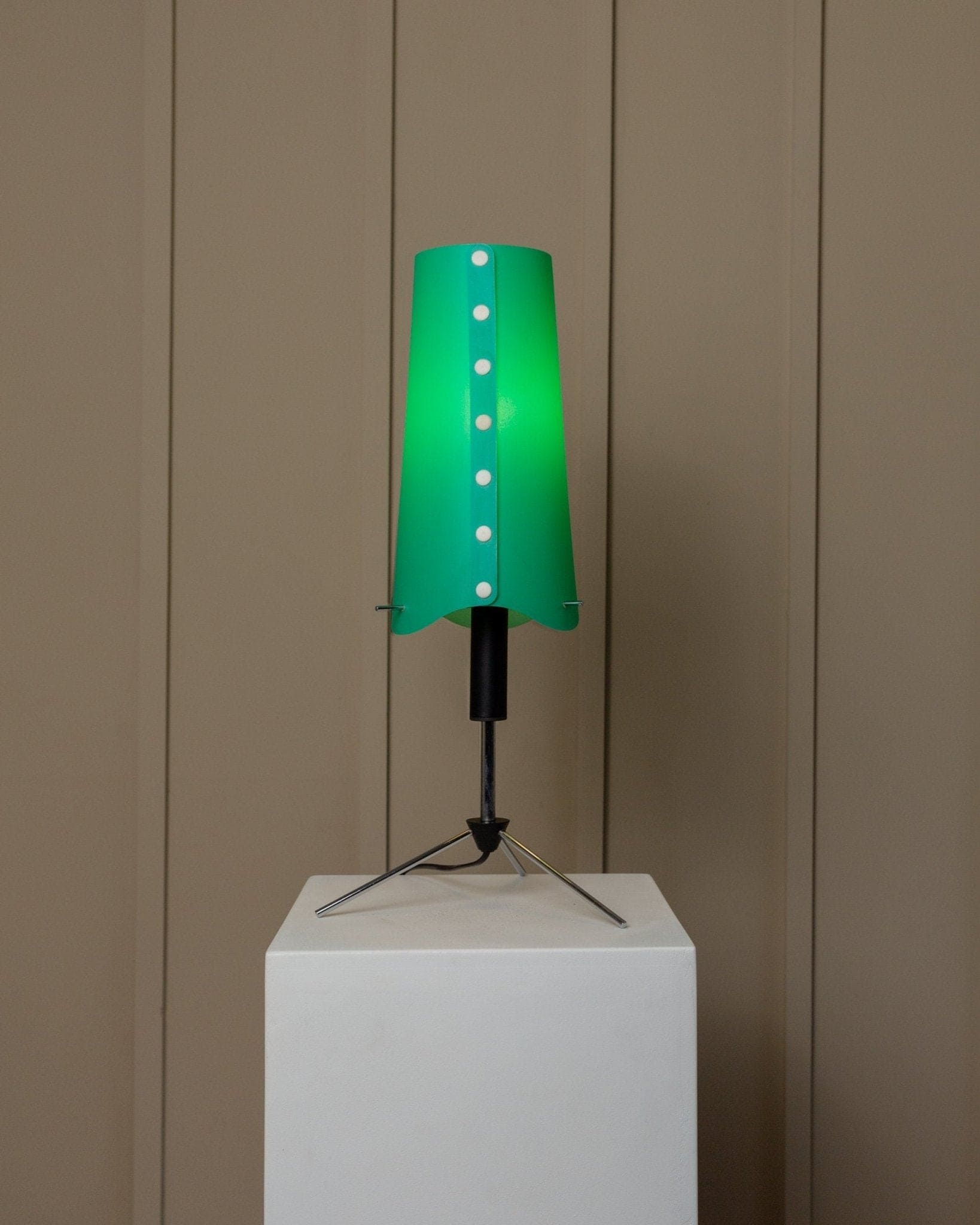 Entdecke diese seltene Vintage Tischlampe aus den 1980er Jahren, gefertigt in Italien im postmodernen Memphis-Stil. Mit einem verstellbaren Metallrahmen in Schwarz und Chrom sowie einem grünen, gewellten Kunststofflampenschirm mit weißem Knopfbesatz ist sie ein echter Hingucker. Diese Lampe ist nicht nur dekorativ, sondern auch besonders. Eine zweite Lampe dieser Form in Blau ist ebenfalls im Shop erhältlich – ideal als Paar für zwei Nachttische oder das Büro. Jetzt mit kostenlosem weltweitem Versand!