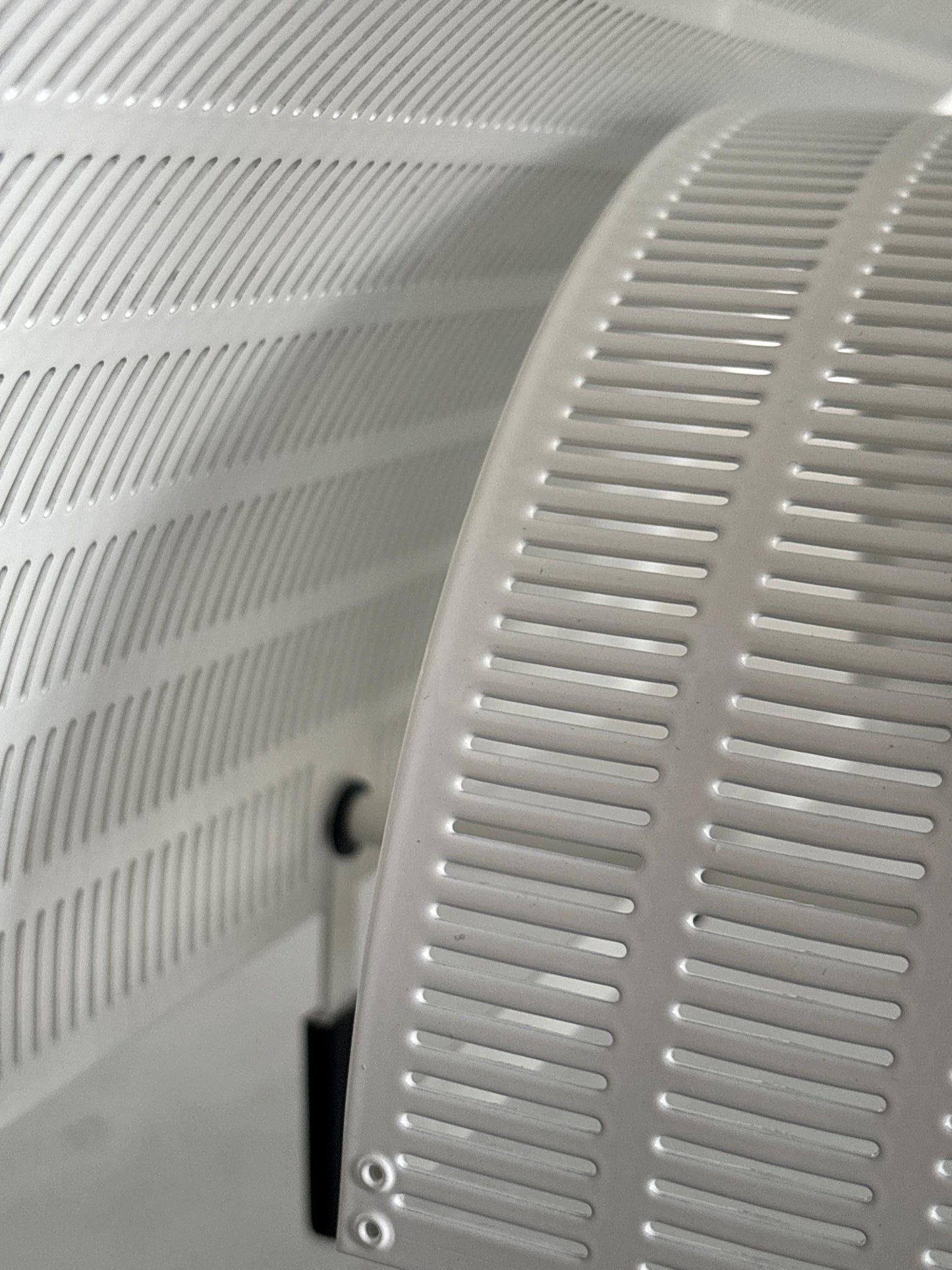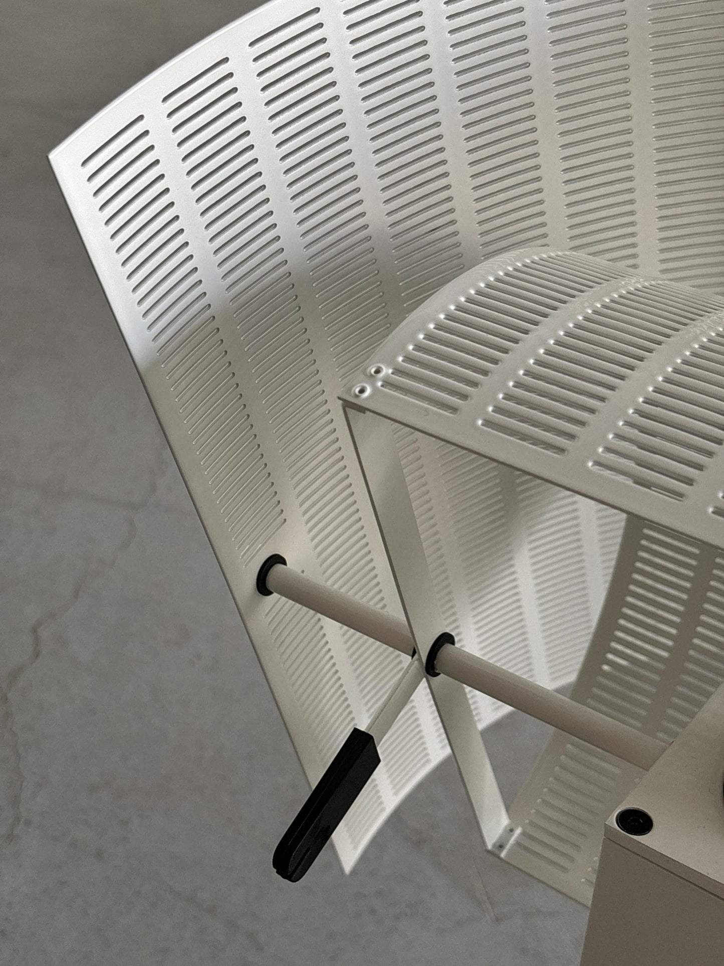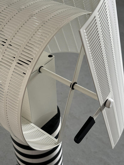 - Design: Schwarz-weiß gestreifter Stiel, perforierte weiße Metallschirme