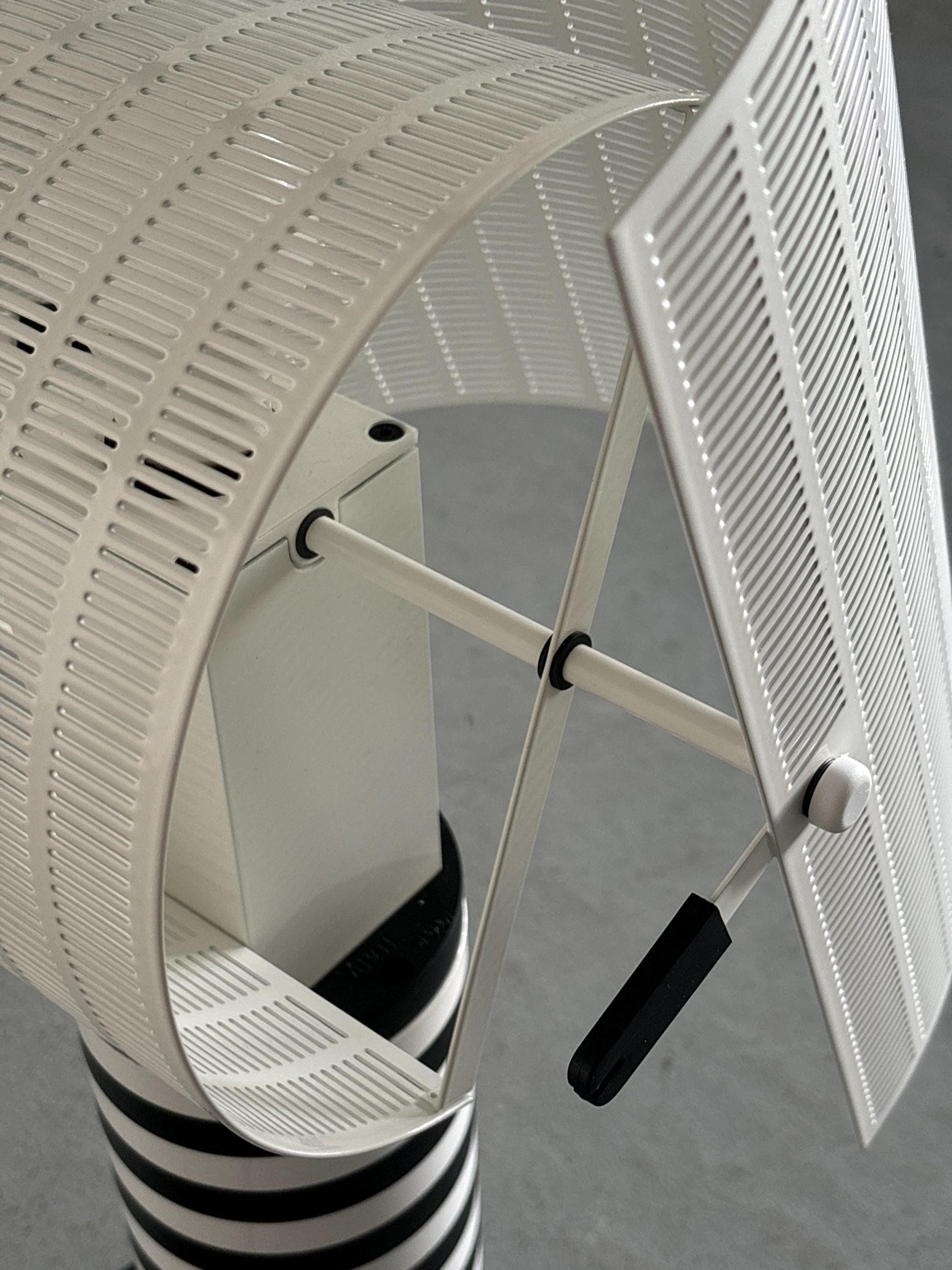 Die "Shogun" Tischlampe ist nicht nur ein Beleuchtungsobjekt, sondern ein Gesprächsstoff für jedes Zuhause. Ihre einzigartige Form und die bicolore Gestaltung machen sie zu einem Highlight in jedem Raum. Die Lampe ist in einem ausgezeichneten Zustand und zeigt nur minimale Gebrauchsspuren, die ihrem Vintage-Charme keinen Abbruch tun. Lass dich von der Magie dieser Lampe verzaubern und bringe ein Stück Designgeschichte in dein Zuhause.
