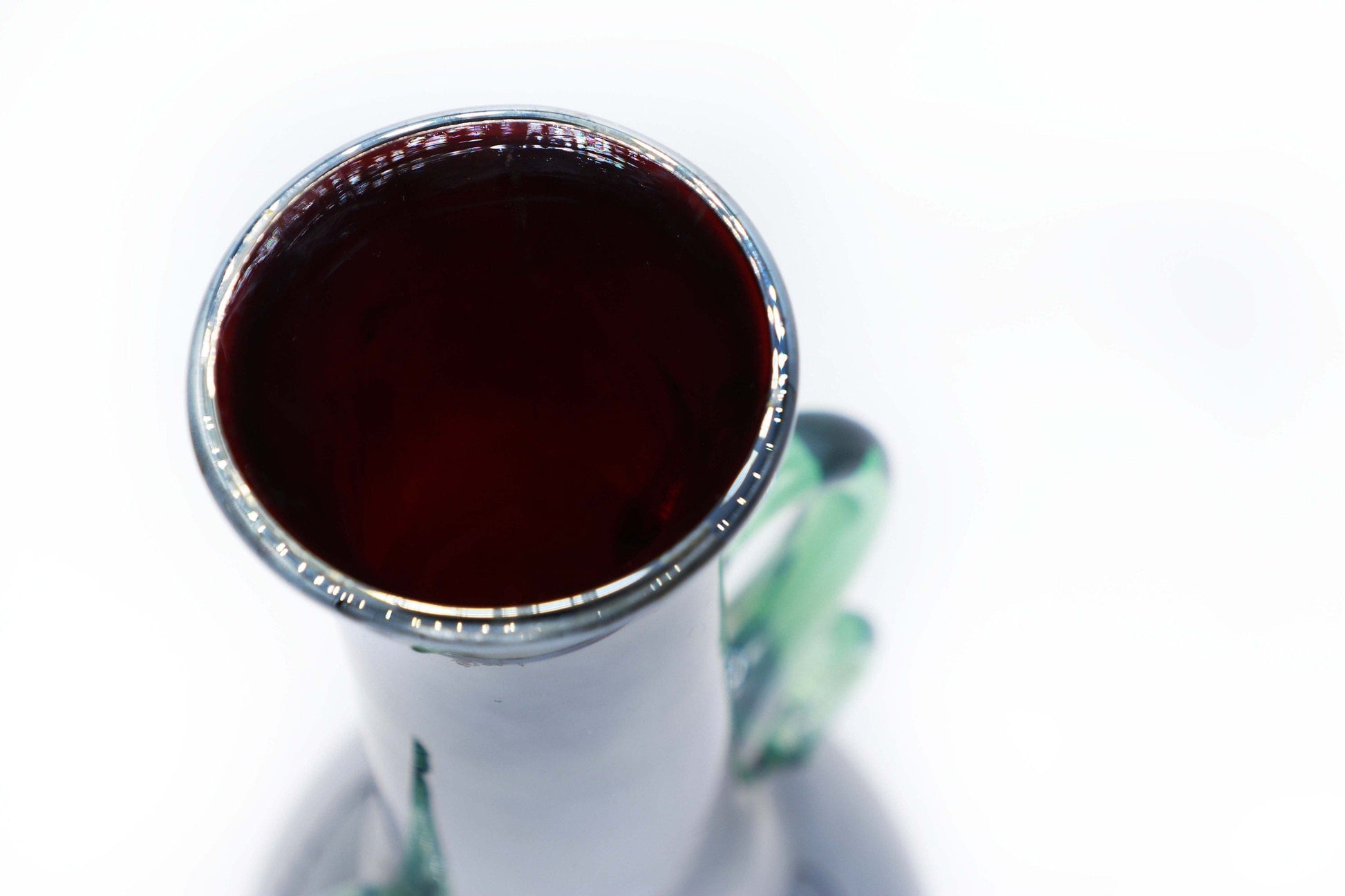 Eine Abrissglas Henkelvase, wohl böhmischer Jugendstil. Fast schwarz wirkendes Glas, überzogen von einer irisierenden, metallischen Schicht. Bei genauerem Hinsehen und mit Hilfe von Sonnenlicht erkennt man, dass die Vase eigentlich dunkelrot ist. Die Henkel bestehen aus mintgrünem, transparentem Glas. Höchste Verarbeitungskunst