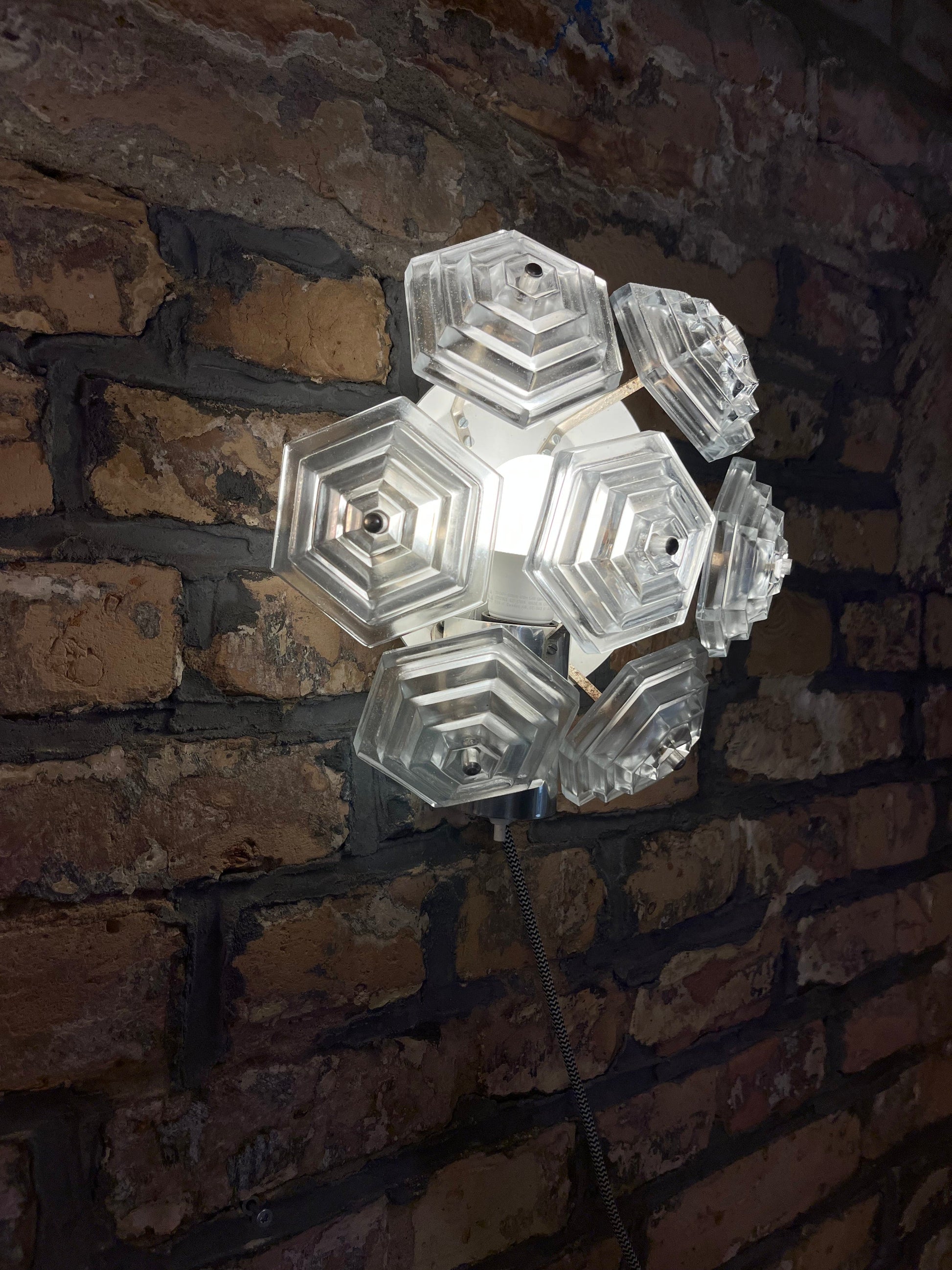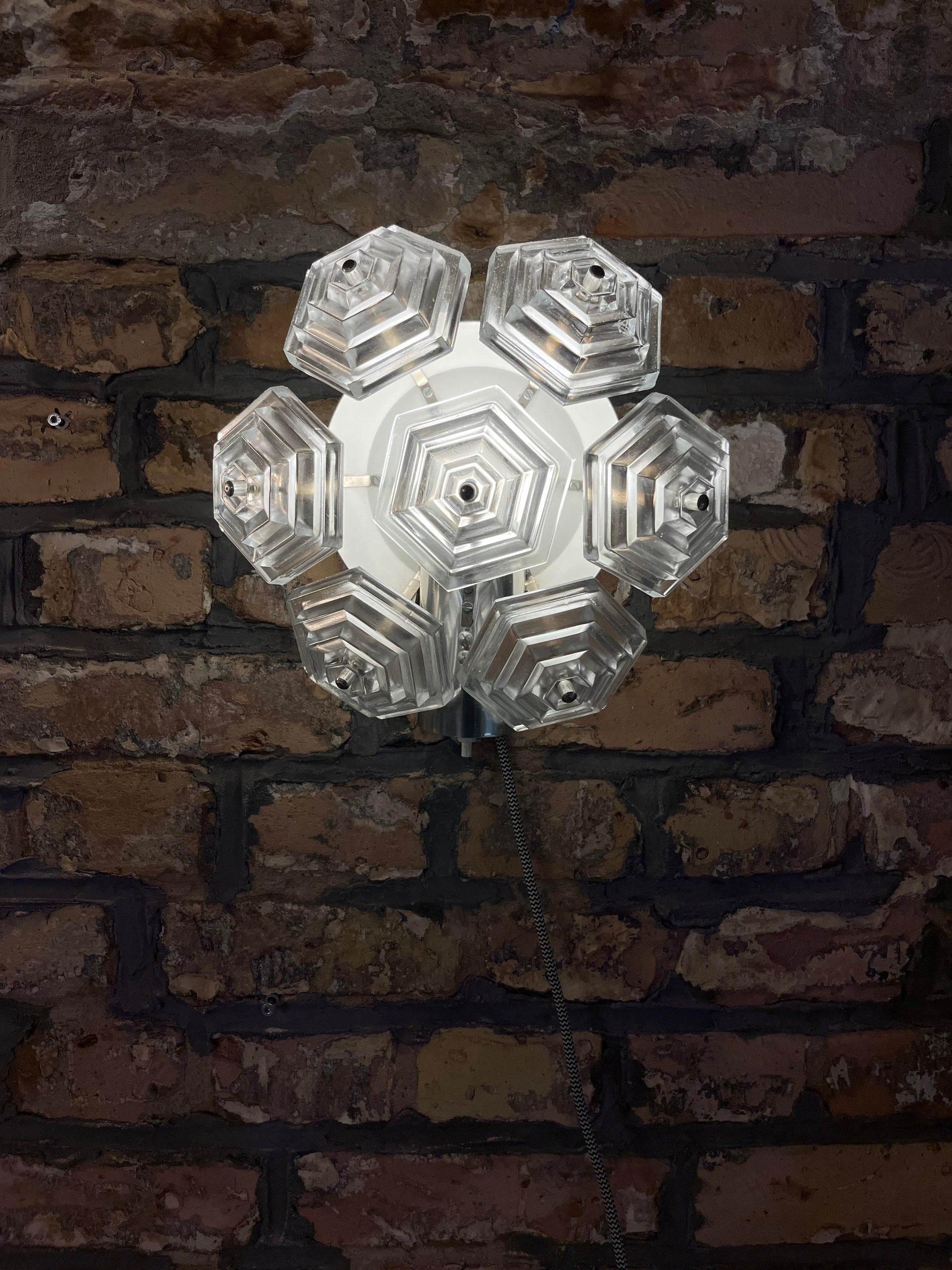 Die Vintage Wandlampe „Eiskristall“ von VEB Kristallleuchtenbau Ebersbach bringt den Charme der 70er Jahre direkt in Dein Zuhause. Mit ihrer einzigartigen Rundung aus sieben Hexagon-Elementen erinnert die Struktur an einen funkelnden Eiskristall. Das leicht milchige Glas verstärkt den frostigen Effekt und sorgt für ein stimmungsvolles Lichtspiel. Diese Wandlampe ist das futuristische Pendant zur bekannten Pusteblume-Serie und überzeugt durch ihre hochwertige Verarbeitung.