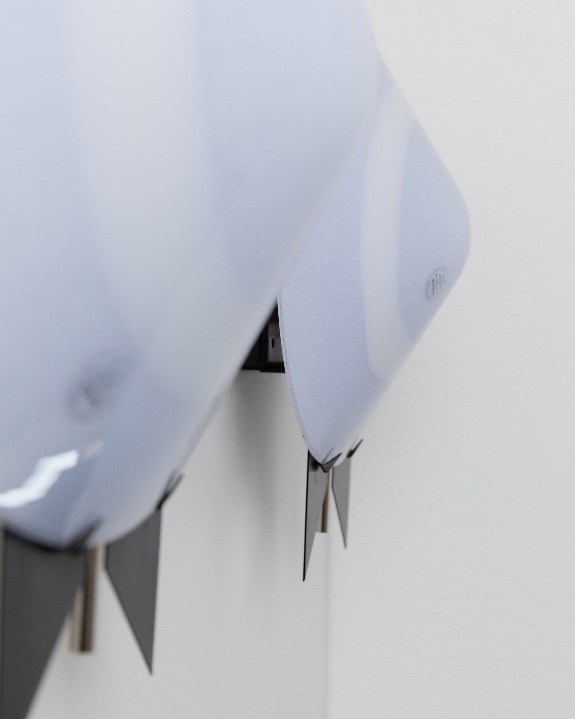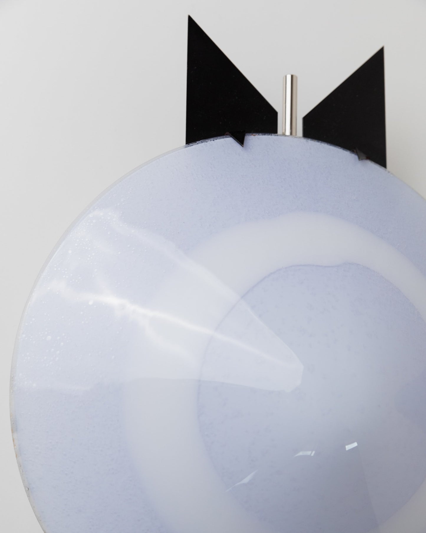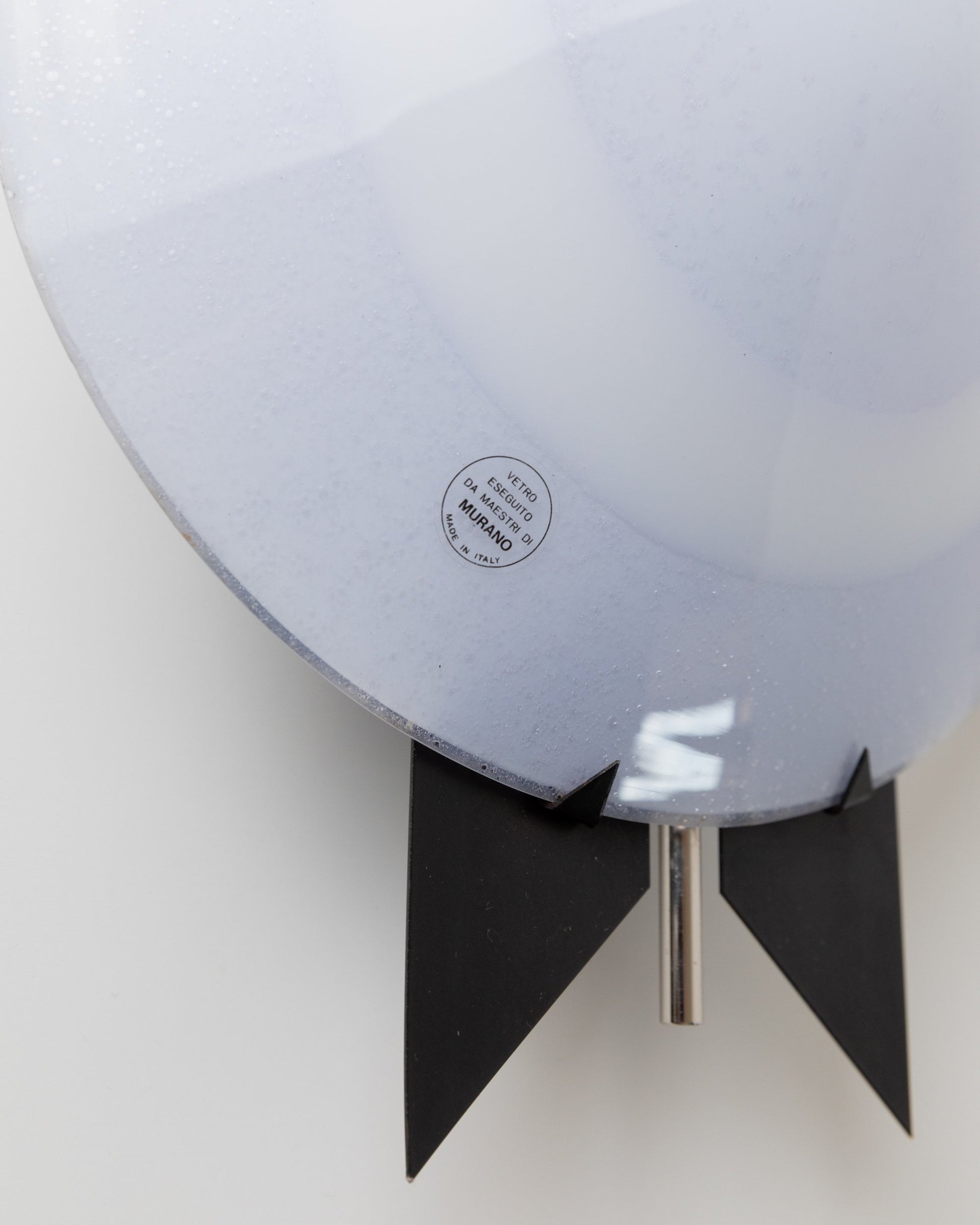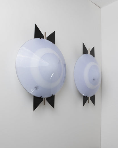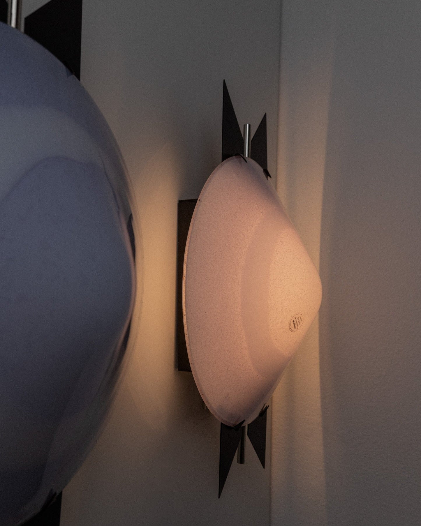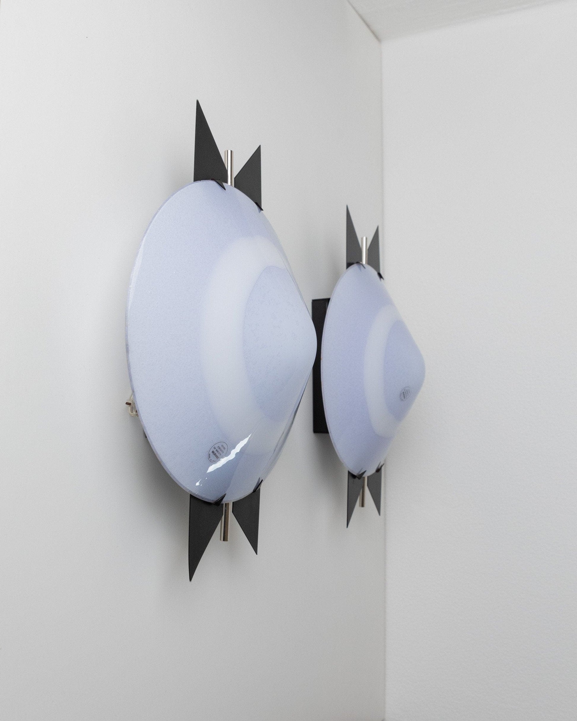 Verleihe Deinem Zuhause mit diesen Vintage Wandleuchten aus Murano Glas einen Hauch von Mid-Century Modern Eleganz. Die hellblauen Glas-Schalen, kombiniert mit schwarzen Zackenhalterungen, verkörpern den ikonischen Memphis-Stil der 1980er Jahre. Die weißen Streifen im Glas und das klare Design schaffen eine zeitlose Eleganz, die sich perfekt in moderne Wohnräume einfügt. Diese Leuchten sind ein echtes Highlight für jede Wand und ein ideales Geschenk für Liebhaber von Retro- und Designklassikern.
