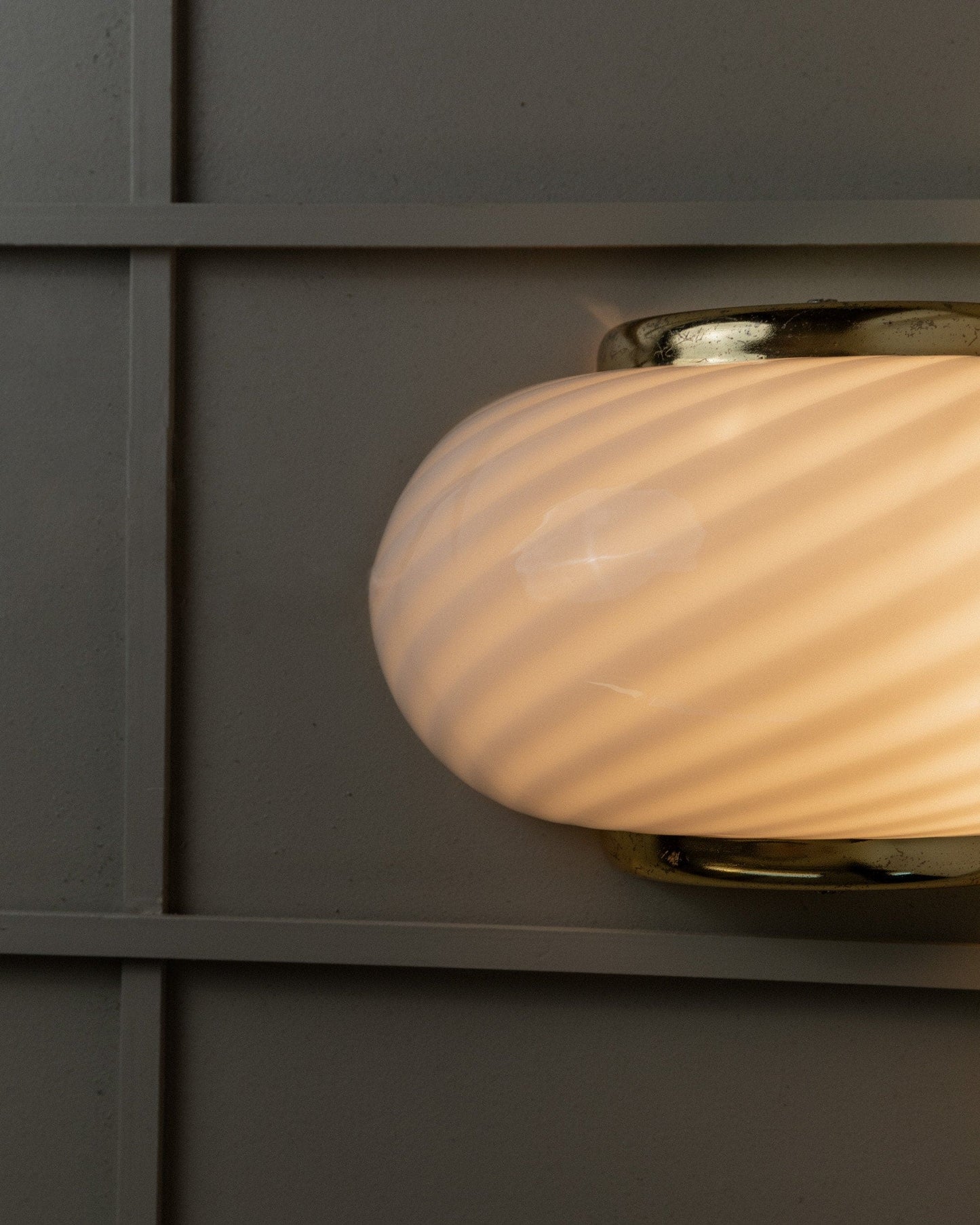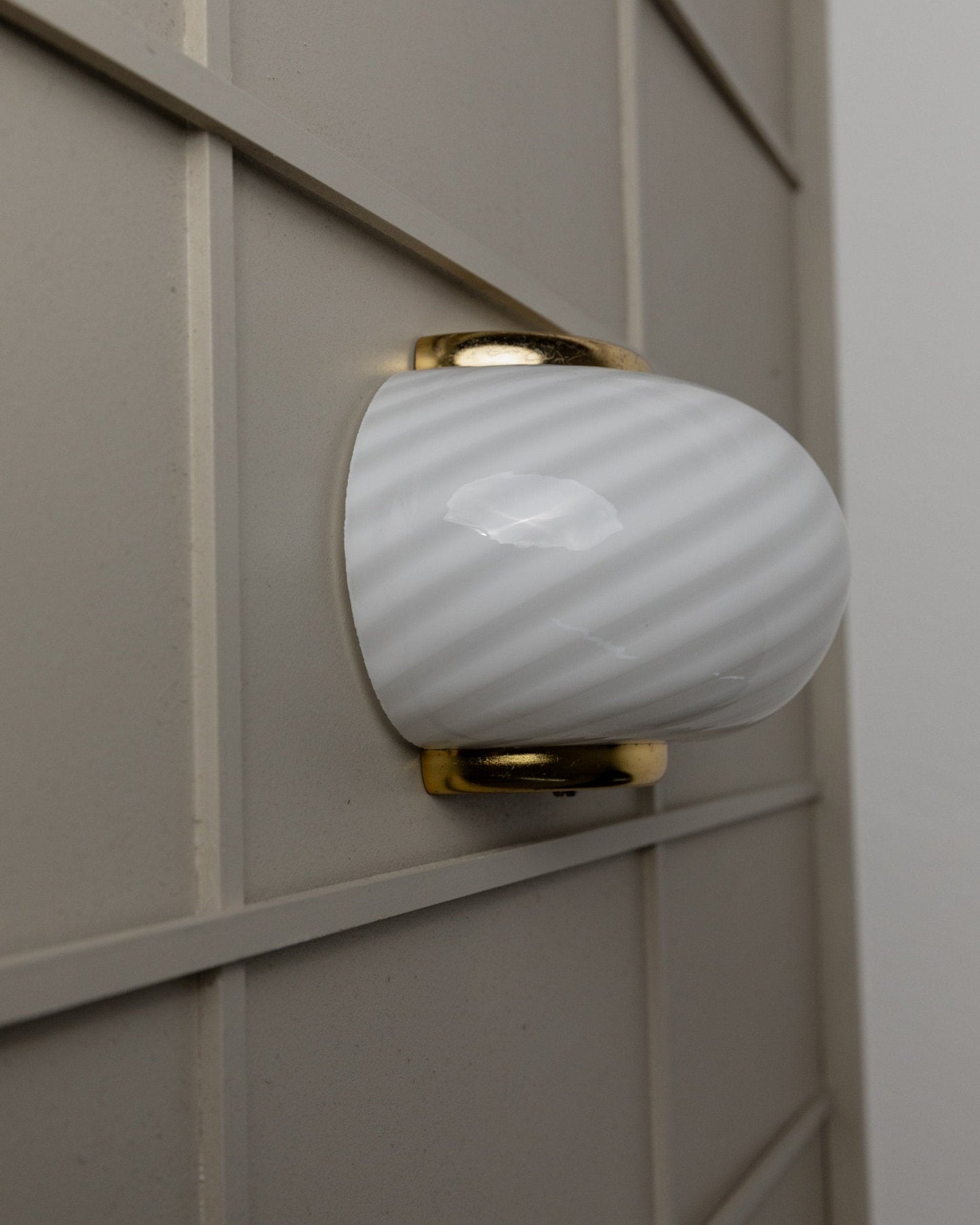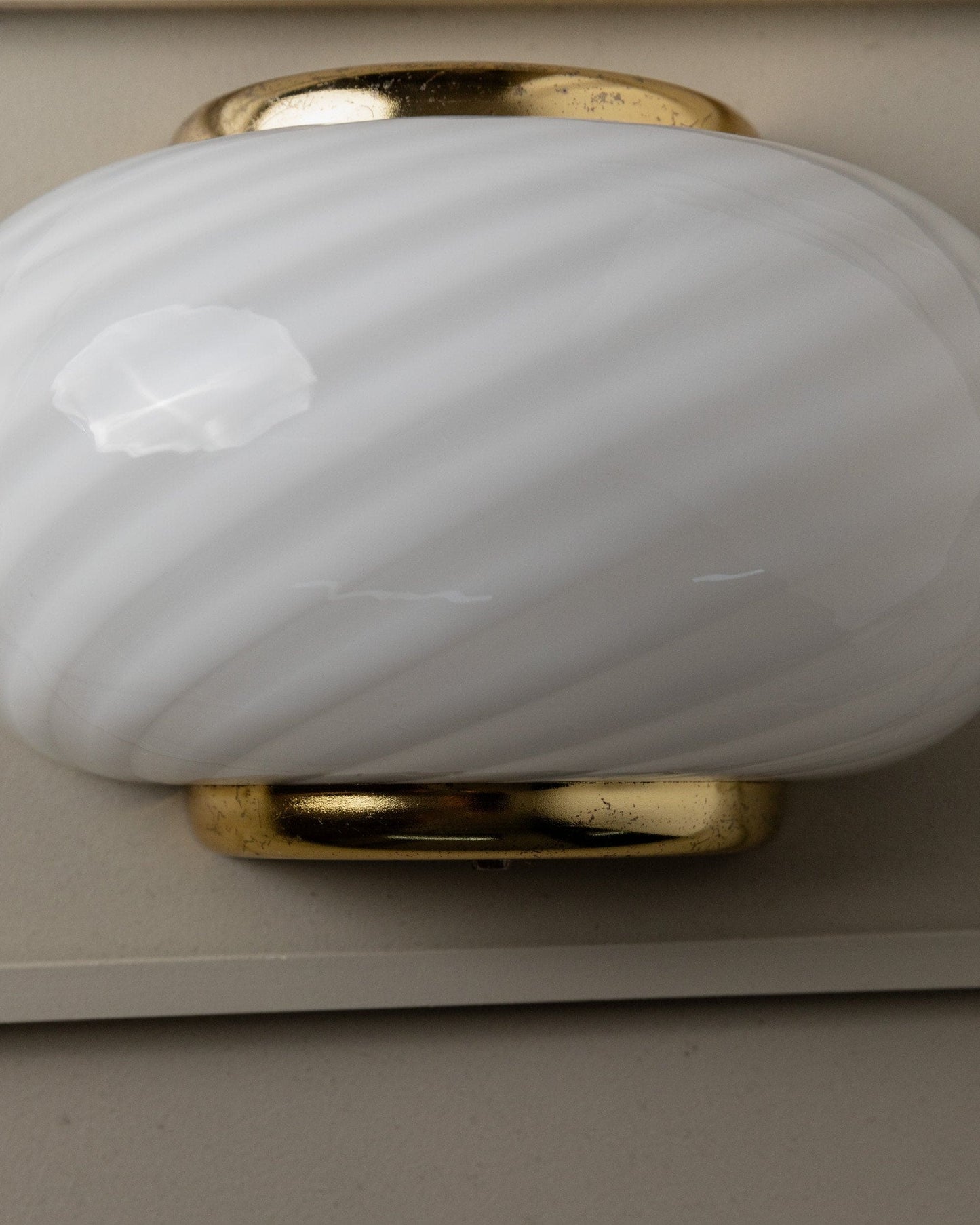 Verleihe Deinem Zuhause mit dieser Vintage Wandleuchte aus Murano Glas einen Hauch von Hollywood Regency. Die Leuchte aus den 1970er Jahren besticht durch ihr klassisches Swirl-Muster und den warmen, eleganten Charme. Das weiße Glas in Kombination mit den Messingdetails schafft eine zeitlose Ästhetik, die in jedem Raum stilvolle Beleuchtung bietet. Die weichen Streifen im Glas erzeugen ein wunderschönes, diffuses Licht, das eine angenehme Atmosphäre schafft.