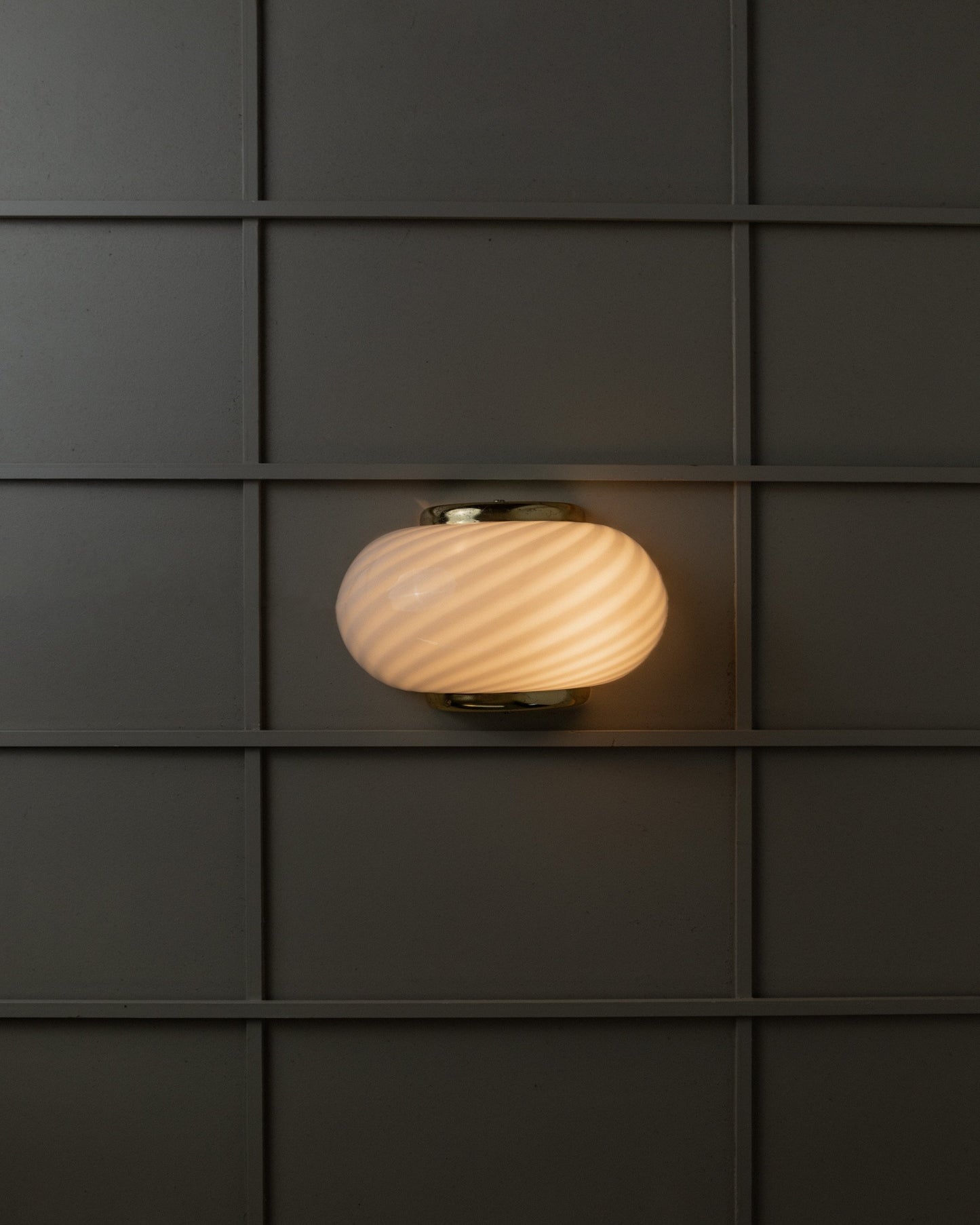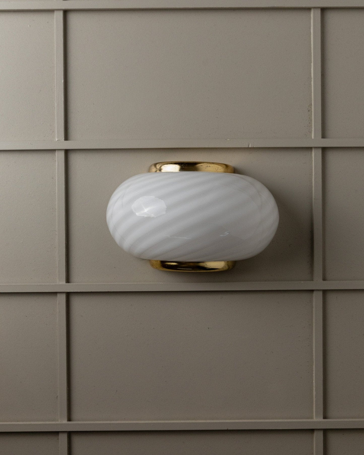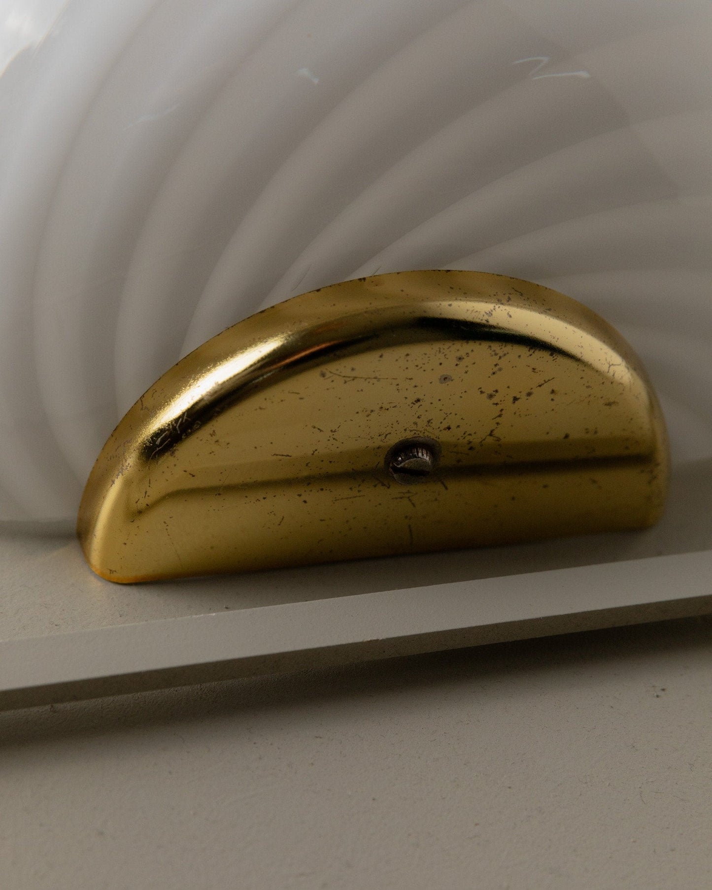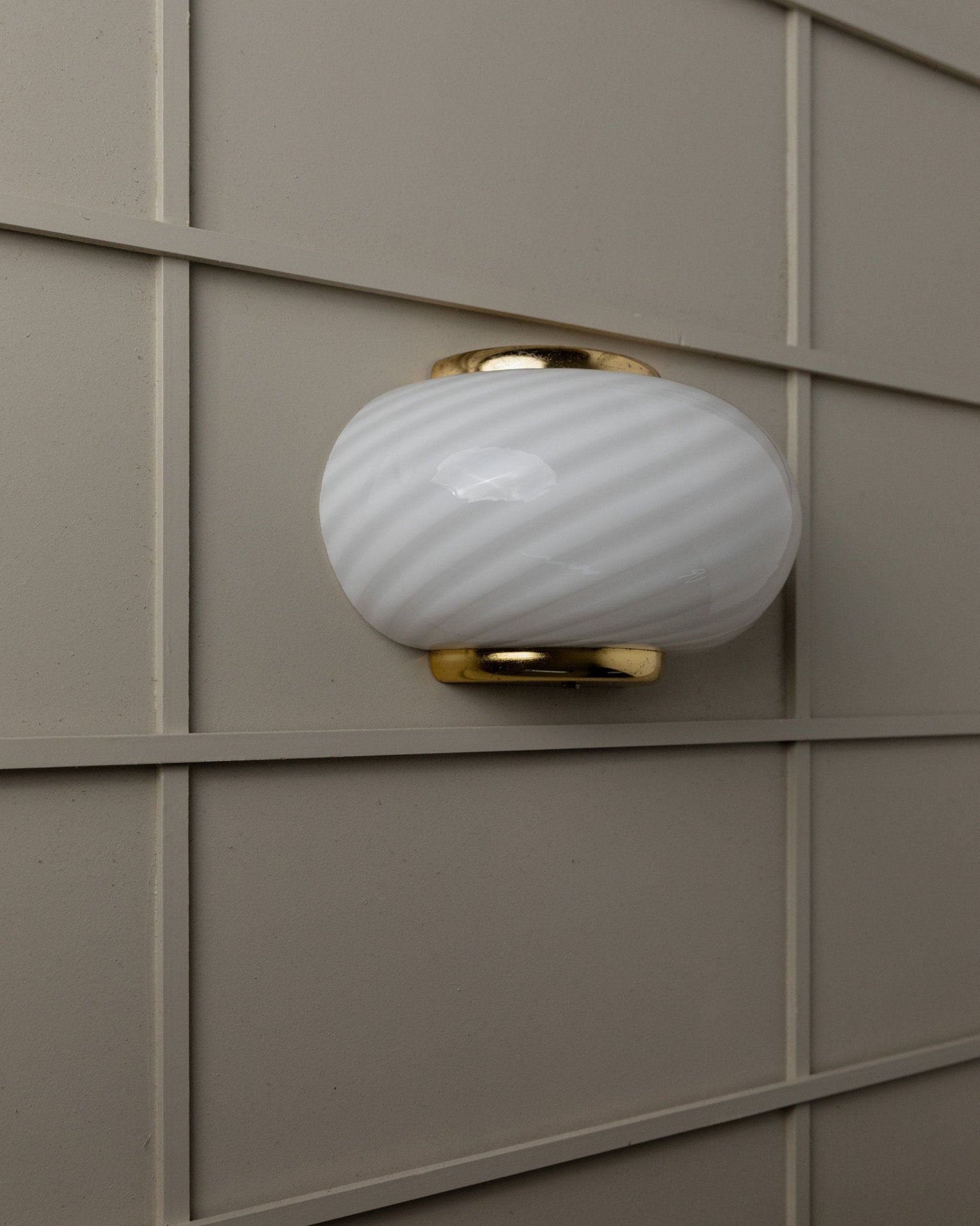 Verleihe Deinem Zuhause mit dieser Vintage Wandleuchte aus Murano Glas einen Hauch von Hollywood Regency. Die Leuchte aus den 1970er Jahren besticht durch ihr klassisches Swirl-Muster und den warmen, eleganten Charme. Das weiße Glas in Kombination mit den Messingdetails schafft eine zeitlose Ästhetik, die in jedem Raum stilvolle Beleuchtung bietet. Die weichen Streifen im Glas erzeugen ein wunderschönes, diffuses Licht, das eine angenehme Atmosphäre schafft.