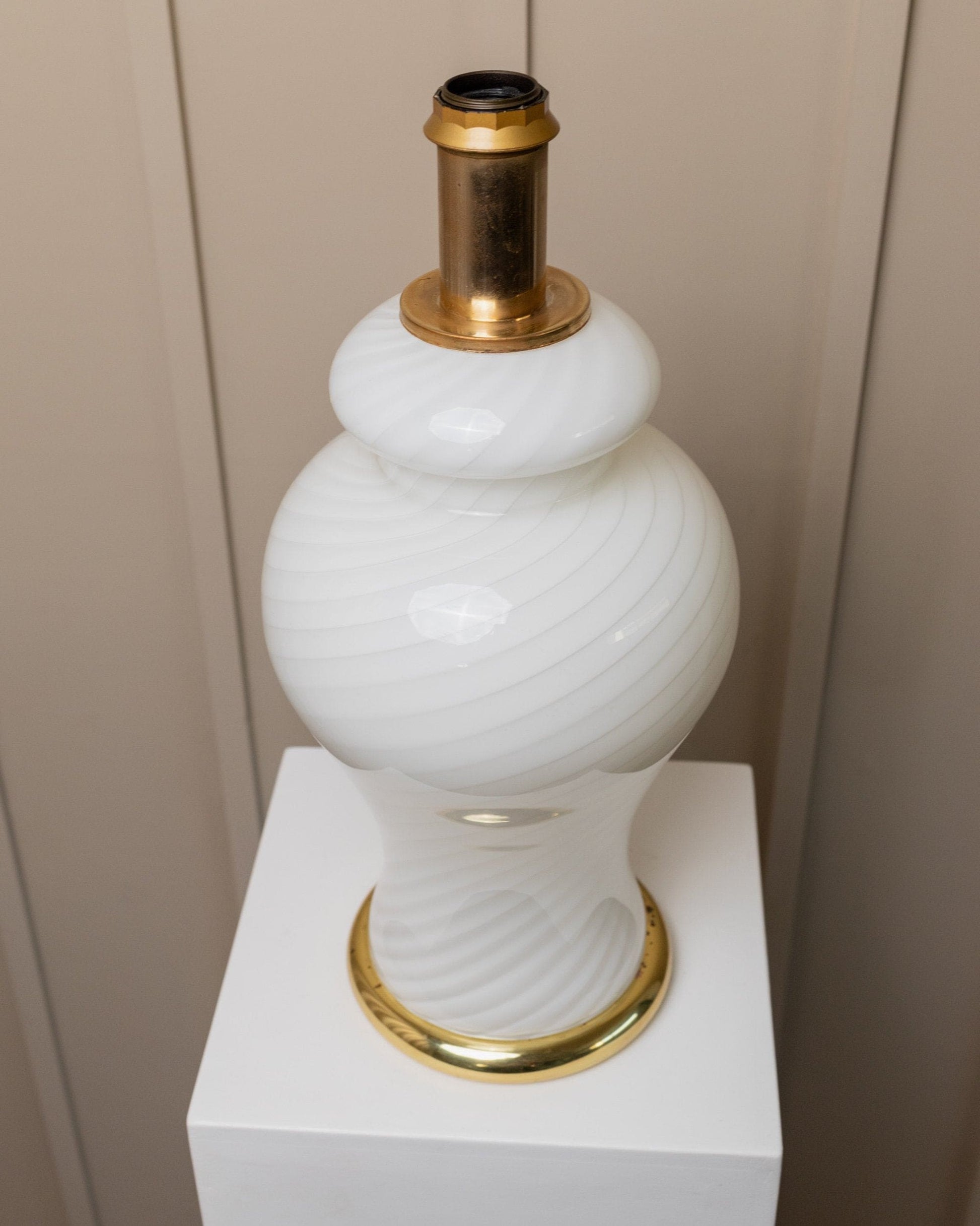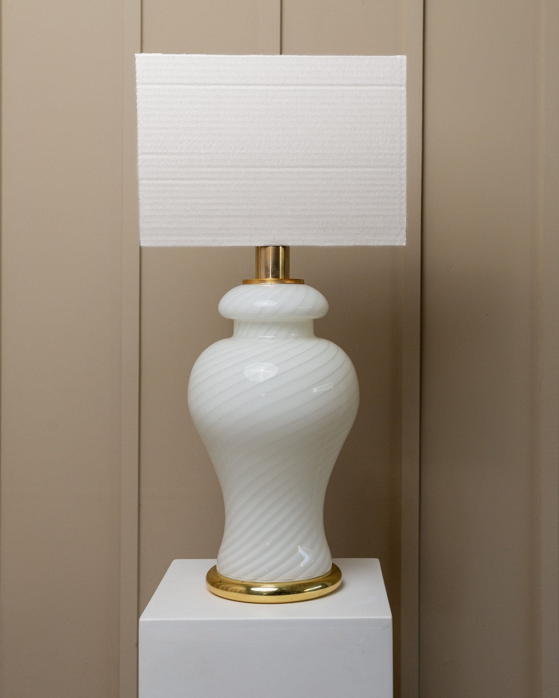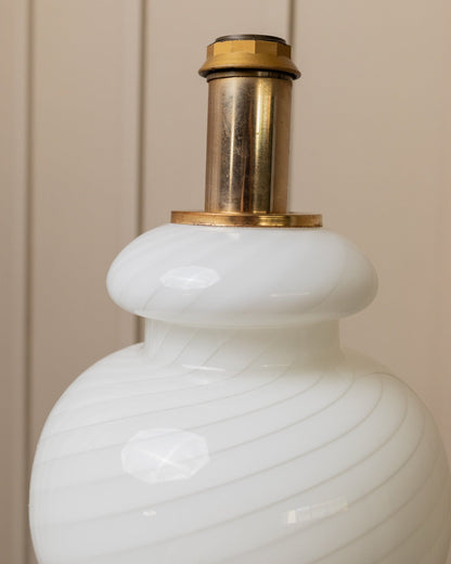 Verleihe Deinem Zuhause mit dieser exquisiten Vintage Tischlampe aus Murano Glas einen Hauch von Mid-Century Modern Eleganz. Diese in den 70er Jahren in Italien hergestellte Lampe besticht durch ihr mundgeblasenes, gewirbeltes Glas, das die herausragende Handwerkskunst der Space Age Ära widerspiegelt. Die zeitlose weiße Farbe fügt sich nahtlos in jede Einrichtung ein und macht sie zu einem vielseitigen Dekorationsstück. Perfekt als Einzelstück oder als Paar für den Nachttisch, um Deinem Raum eine stilvolle Note zu verleihen.