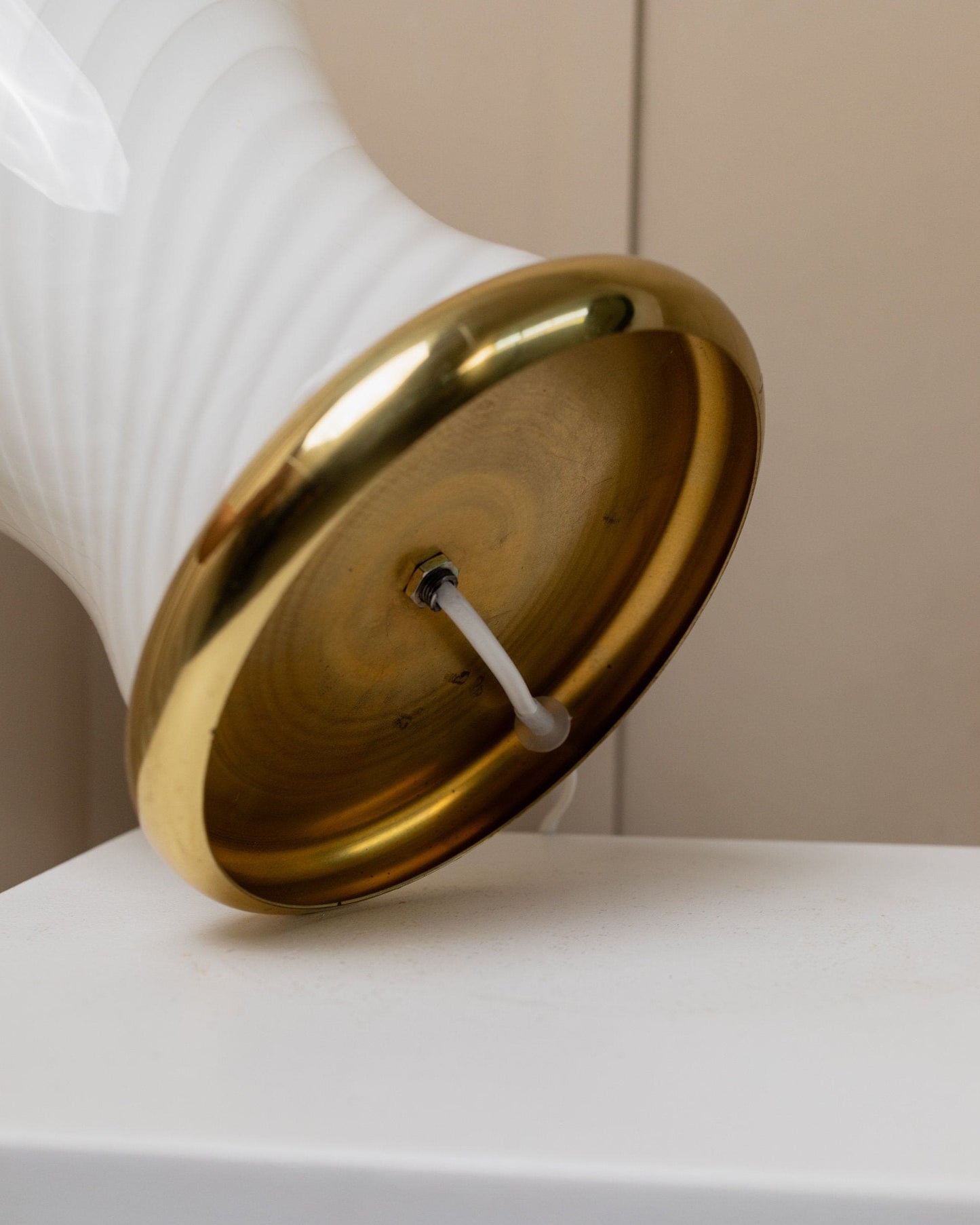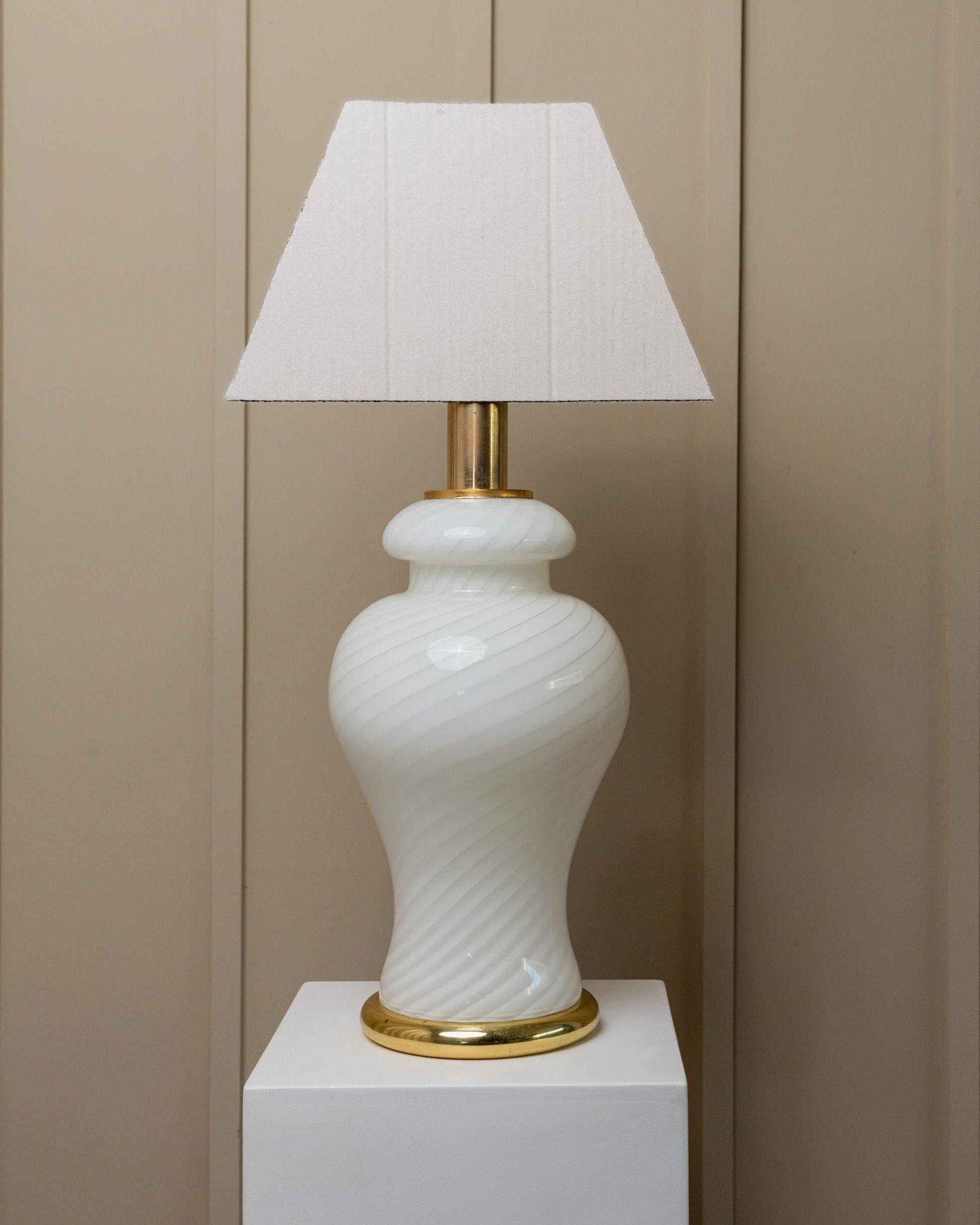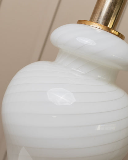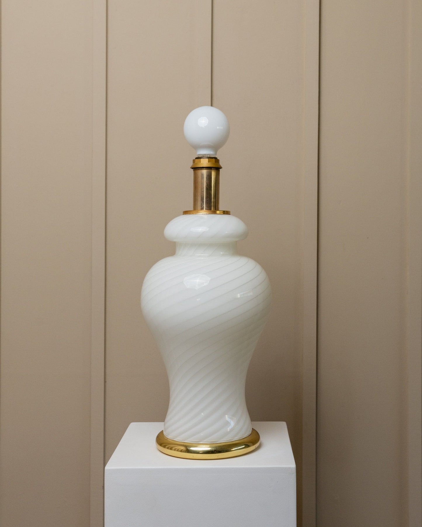 Verleihe Deinem Zuhause mit dieser exquisiten Vintage Tischlampe aus Murano Glas einen Hauch von Mid-Century Modern Eleganz. Diese in den 70er Jahren in Italien hergestellte Lampe besticht durch ihr mundgeblasenes, gewirbeltes Glas, das die herausragende Handwerkskunst der Space Age Ära widerspiegelt. Die zeitlose weiße Farbe fügt sich nahtlos in jede Einrichtung ein und macht sie zu einem vielseitigen Dekorationsstück. Perfekt als Einzelstück oder als Paar für den Nachttisch, um Deinem Raum eine stilvolle Note zu verleihen.